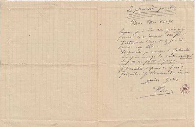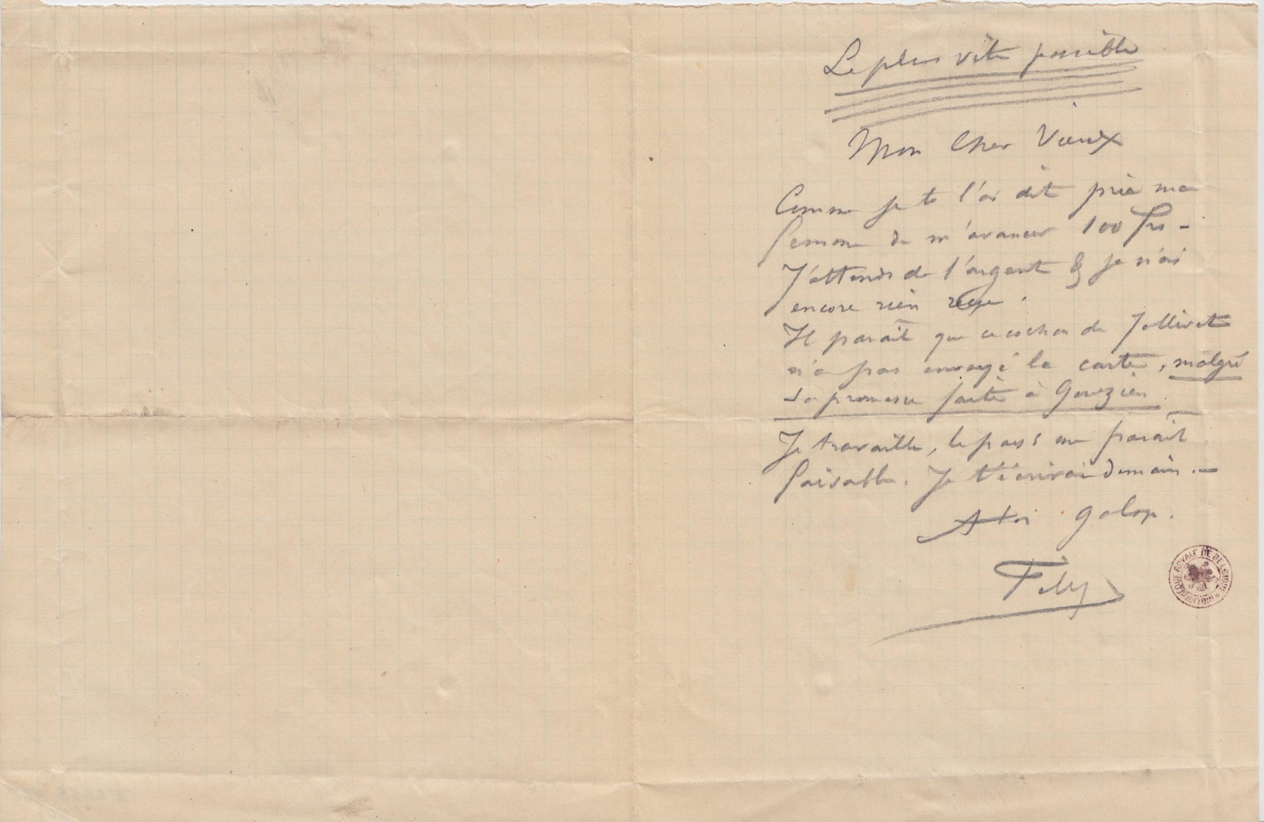 Comme je te l’ai dit prie ma femme de m’avancer 100 frs – J’attends de l’argent & je n’ai encore rien reçu.