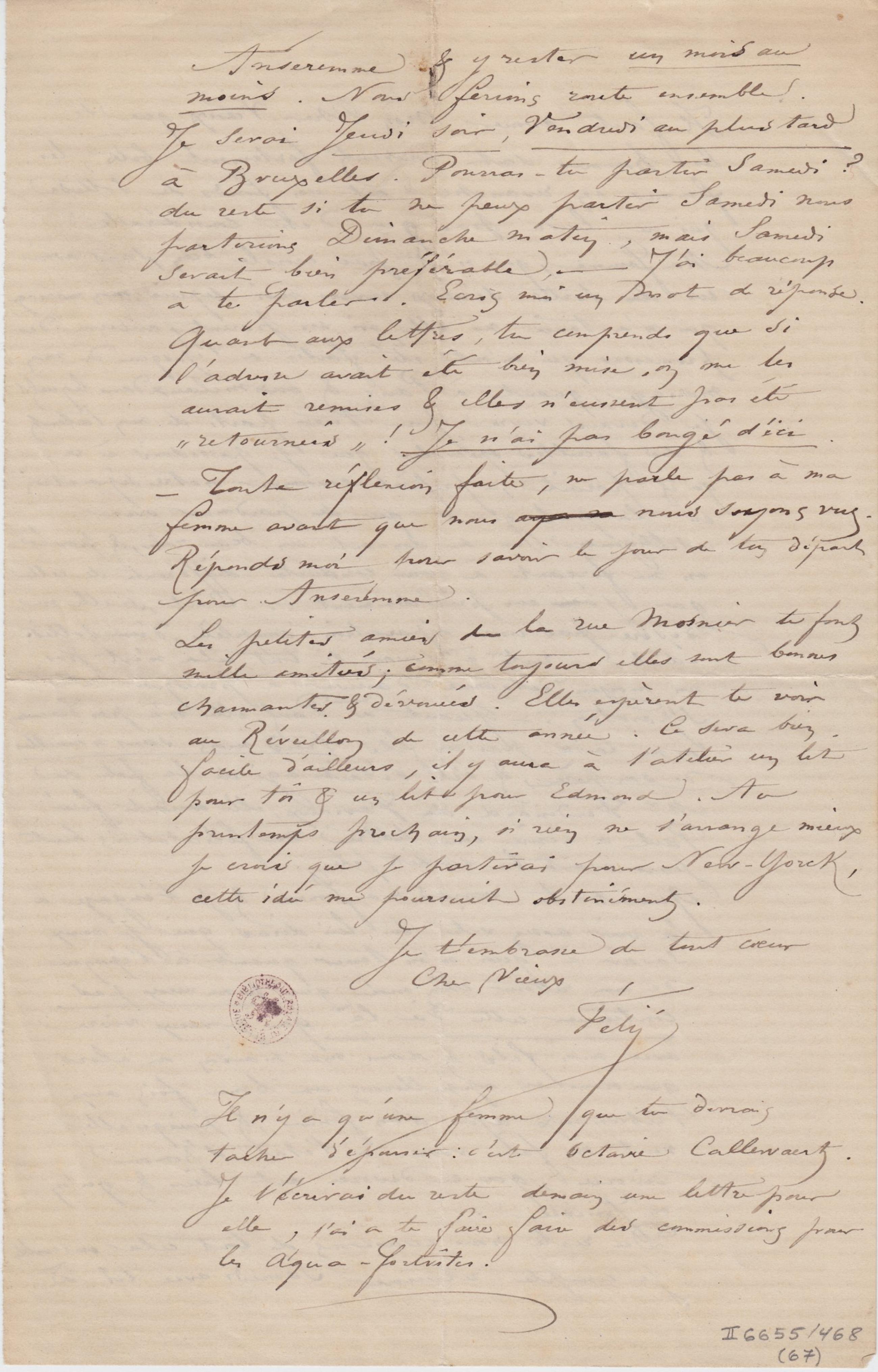 Il n’y a qu’une femme que tu devrais tacher d’épouser : c’est Octavie Callewaert. Je t’écrirai du reste demain une lettre pour elle, j’ai a te faire faire des commissions pour les Aqua-Fortistes.