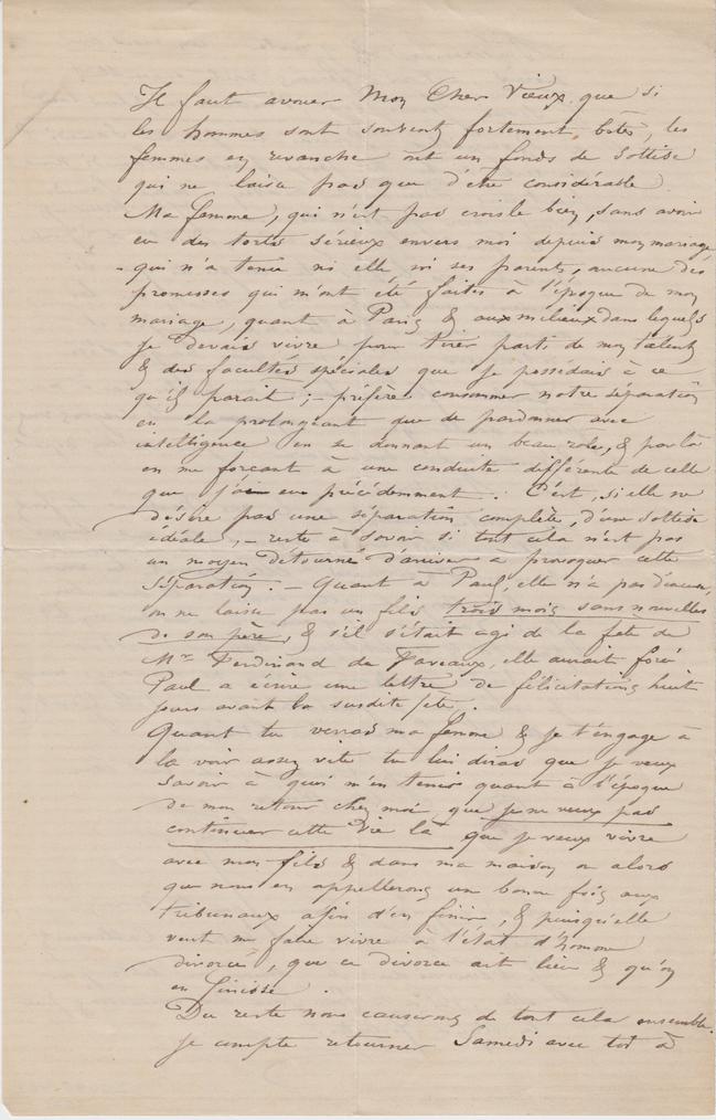 Il faut avouer Mon Cher Vieux, que si les hommes sont souvent fortement bêtes, les femmes en revanche ont un fonds de sottise qui ne laisse pas que d’être considérable. Ma femme, qui n’est pas crois le bien, sans avoir eu des torts sérieux envers moi depuis mon mariage, – qui n’a tenu ni elle ni ses parents, aucune des promesses qui m’ont été faites à l’époque de mon mariage, quant à Paris & aux milieux dans lesquels je devais vivre pour tirer parti de mon talent & des facultés spéciales que je possédais à ce qu’il paraît ; – préfère consommer notre séparation en la prolongeant que de pardonner avec intelligence en se donnant un beau rôle, & par là en me forçant à une conduite différente de celle que j’ai eue précédemment. C’est, si elle ne désire pas une séparation complète, d’une sottise idéale, – reste à savoir si tout cela n’est pas un moyen détourné d’arriver à provoquer cette séparation. – Quant à Paul, elle n’a pas d’excuse, on ne laisse pas un fils trois mois sans nouvelles de son père, & s’il s’était agi de la fête de MrFerdinand de Faveaux, elle aurait forcé Paul a écrire une lettre de félicitations huit jours avant la susdite fête.