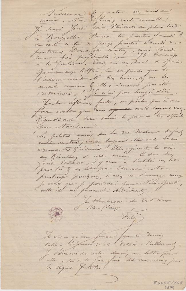 Anseremme & y rester un mois au moins. Nous ferions route ensemble. Je serai Jeudi soir, Vendredi au plus tard à Bruxelles. Pourras-tu partir Samedi ? du reste si tu ne peux partir Samedi nous partirions Dimanche matin, mais Samedi serait bien préférable, – J’ai beaucoup à te parler. Écris moi un mot de réponse. Quant aux lettres, tu comprends que si l’adresse avait été bien mise, on me les aurait remises & elles n’eussent pas été « retournées » ! Je n’ai pas bougé d’ici. – Toute réflexion faite, ne parle pas à ma ayons sa nous soyons vus. Réponds moi pour savoir le jour de ton départ pour Anseremme.