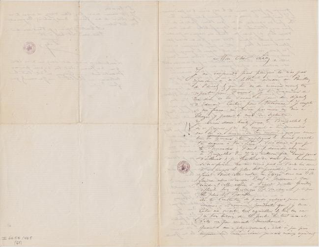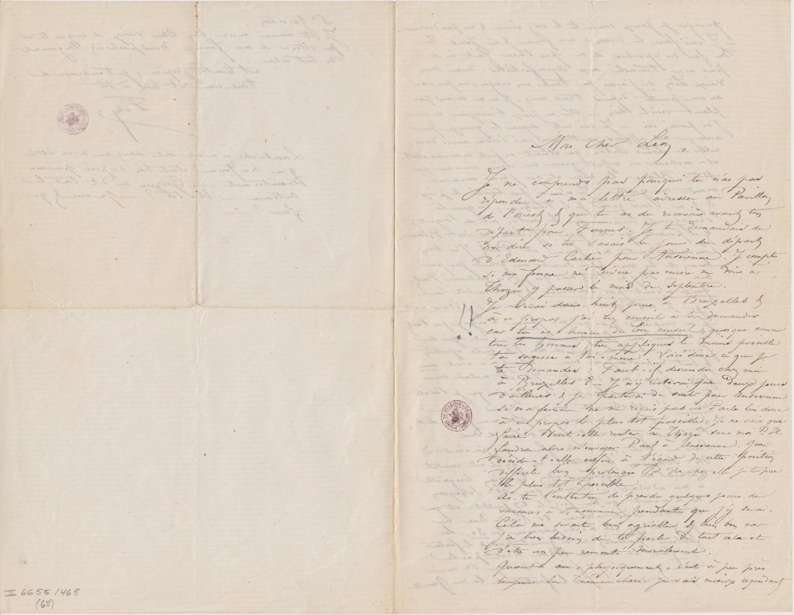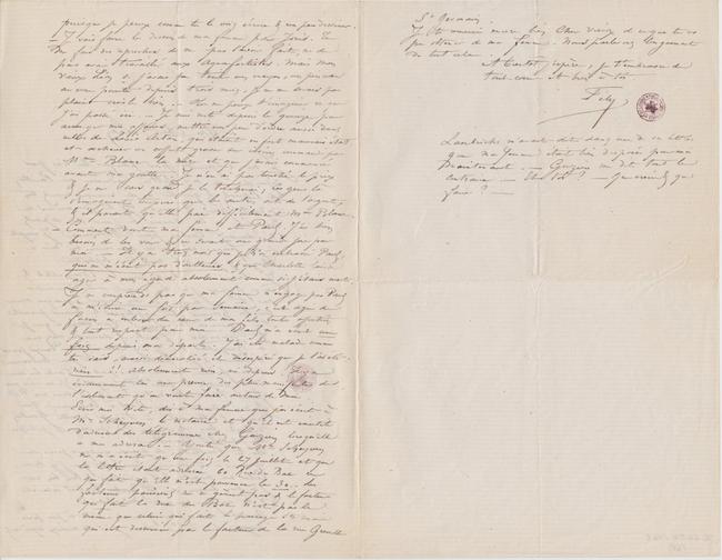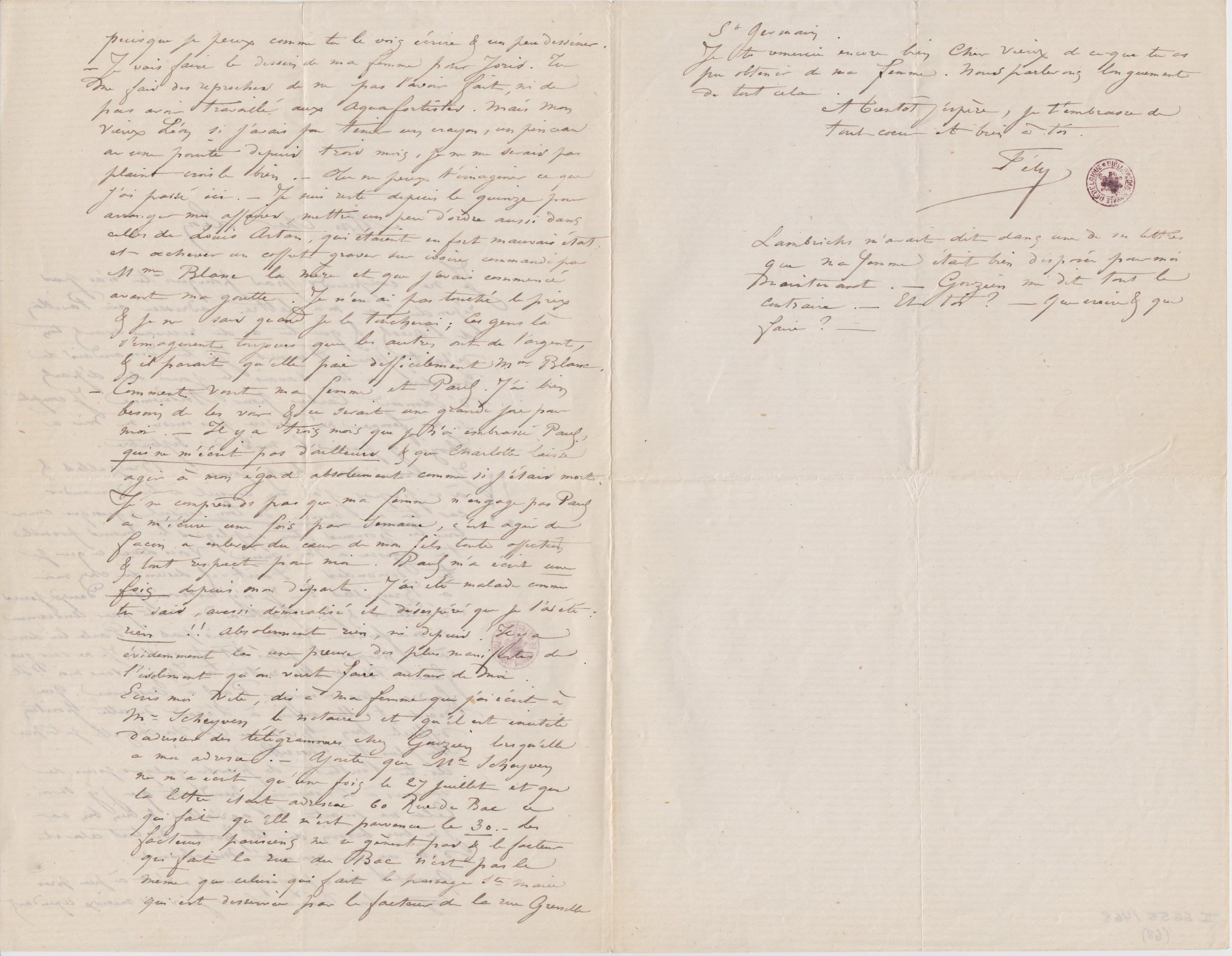 puisque je peux comme tu le vois écrire & un peu dessiner – Je vais faire le dessin de ma femme pour Joris. Tu me fais des reproches de ne pas l’avoir fait, ni de pas avoir travaillé aux Aquafortistes. Mais Mon Vieux Léon si j’avais pu tenir un crayon, un pinceau ou une pointe depuis trois mois, je ne me serais pas plaint crois le bien. – Tu ne peux t’imaginer ce que j’ai passé ici. – Je suis resté depuis le quinze pour arranger mes affaires, mettre un peu d’ordre aussi dans celles de Louis Artan, qui étaient en fort mauvais état, et achever un coffret graver sur ivoire commandé par Mme Blanc la mère et que j’avais commencé avant ma goutte. Je n’en ai pas touché le prix & je ne sais quand je le toucherai ; Ces gens là s’imaginent toujours que les autres ont de l’argent, & il paraît qu’elle paie difficilement Mme Blanc. – Comment vont ma femme et Paul. J’ai bien besoin de les voir & ce serait une grande joie pour moi. – Il y a trois mois que je n’ai embrassé Paul, qui ne m’écrit pas d’ailleurs & que Charlotte laisse agir à mon égard absolument comme si j’étais mort. Je ne comprends pas que ma femme n’engage pas Paul à m’écrire une fois par semaine, c’est agir de façon à enlever du cœur de mon fils toute affection & tout respect pour moi. Paul m’a écrit une fois depuis mon départ. J’ai été malade comme tu sais, aussi démoralisé et désespéré que je l’ai été : rien !! Absolument rien, ni depuis. Il y a évidemment là une preuve des plus manifestes de l’isolement qu’on veut faire autour de moi.