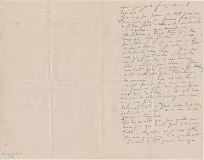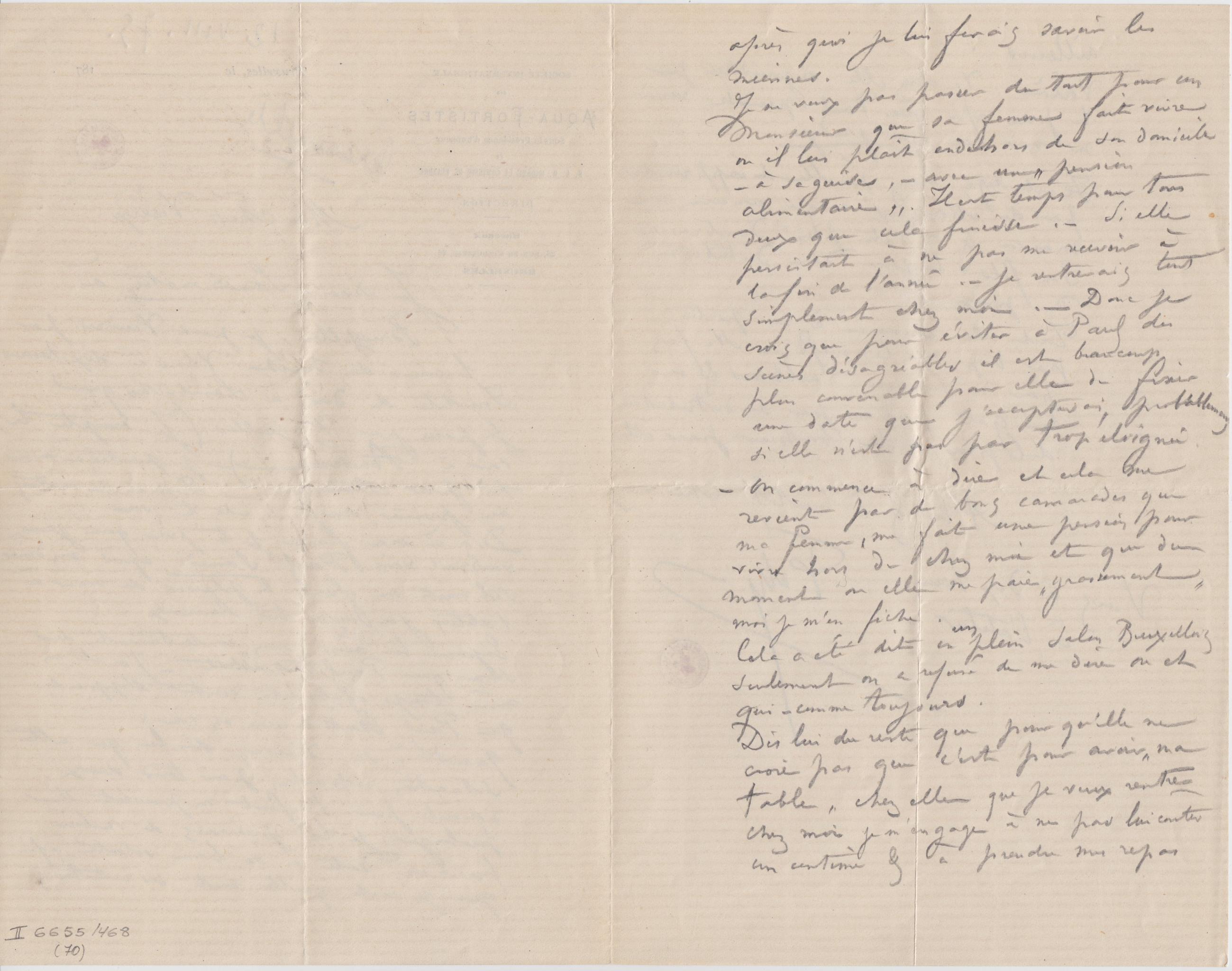 Je ne veux pas passer du tout pour un Monsieur que sa femme fait vivre où il lui plaît endehors de son domicile – à sa guise, – avec une « pension alimentaire ». Il est temps pour tous deux que cela finisse. – Si elle persistait à ne pas me recevoir à la fin de l’année. – je rentrerais tout simplement chez moi. – Donc je crois que pour éviter à Paul des scènes désagréables il est beaucoup plus convenable pour elle de fixer une date que j’accepterai, probablement si elle n’est pas trop éloignée. – On commence à dire et cela me revient par de bons camarades que ma femme, me fait une pension pour vivre hors de chez moi et que du moment où elle me paie « grassement » moi je m’en fiche.