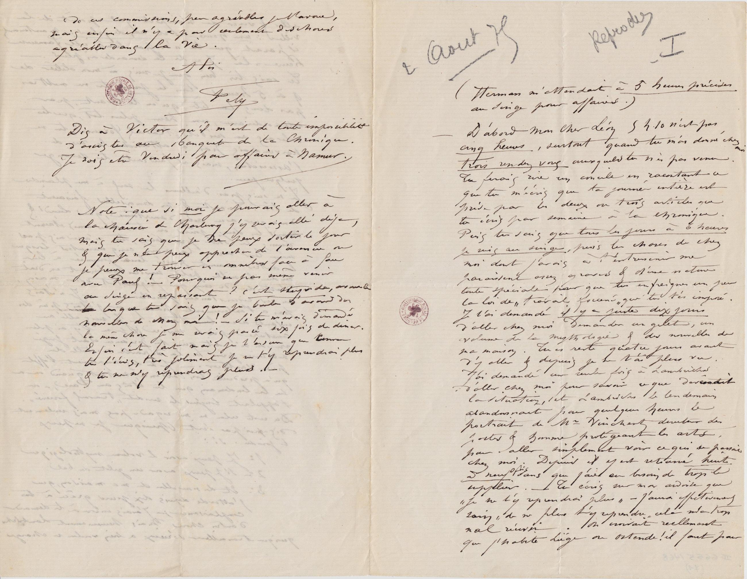 Dis à Victor qu’il m’est de toute impossibilité d’assister au banquet de la Chronique. Je dois être Vendredi pour affaires à Namur.