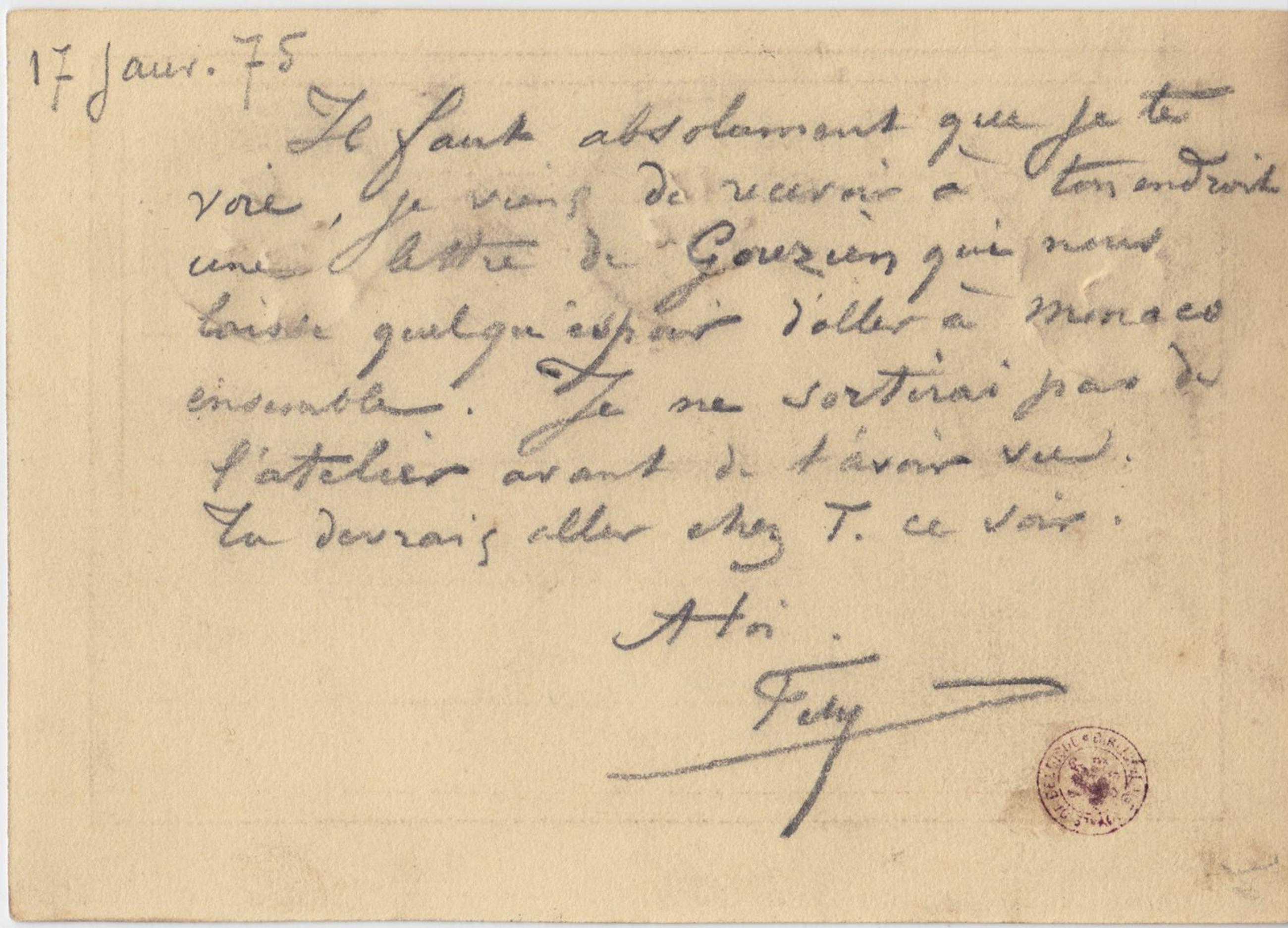 Il faut absolument que je te voie, je viens de recevoir à ton endroit une lettre de Gouzien qui nous laisse quelqu’espoir d’aller à Monaco ensemble. Je ne sortirai pas de l’atelier avant de t’avoir vu. Tu devrais aller chez T. ce soir.