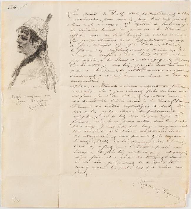 Les soirées de Pesth sont particulièrement belles – admirables, pour nous, & pour tous ceux qui ont « leurs nerfs sur eux ». Le Château de Buda émerge des dernières lueurs du jour que le Danube reflète avec des tons bronzés de vieille armure. Les grands steamers noirs, hyppopotames aux yeux de feu, estompés déjà par l’ombre, sillonnent le fleuve en soufflant, creusant derrière eux des remous de soufre & d’or. Puis, tout se calme par degrés, & les bleus du soir gagnent toujours. Sur les coteaux, bien loin, plongées dans une dernière ondée de lumière, les petites maisons des vignerons s’endorment comme une bande de mouettes ensommeillées.