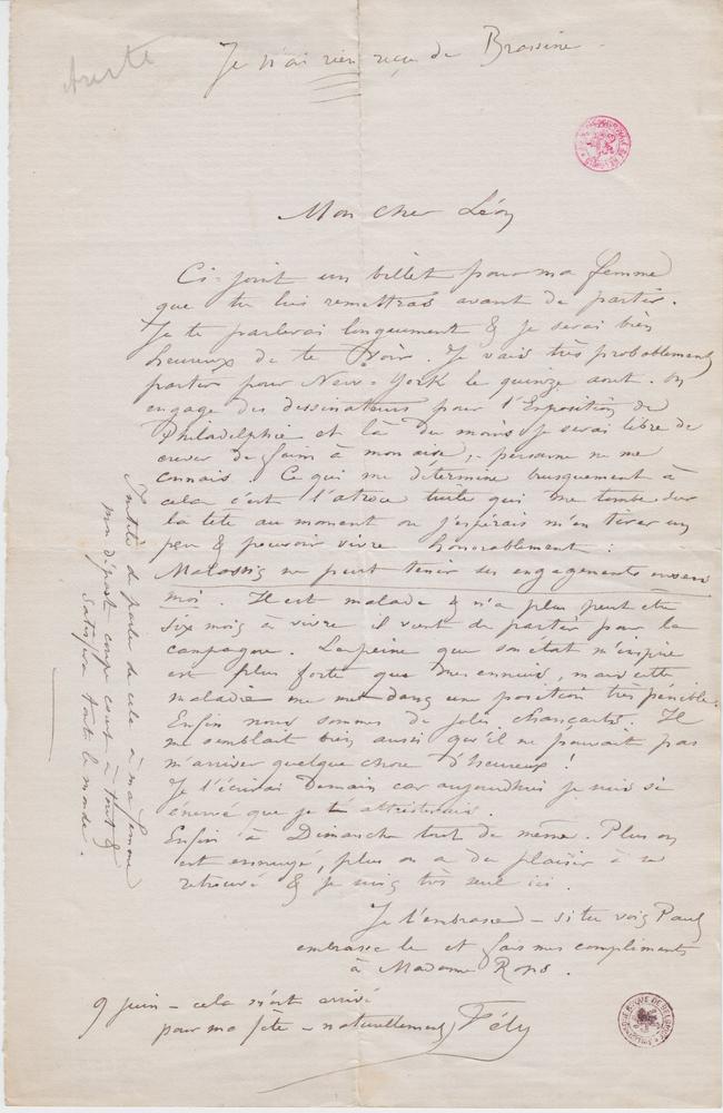 Ci-joint un billet pour ma femme que tu lui remettras avant de partir. Je te parlerai longuement & je serai bien heureux de te voir. Je vais très probablement partir pour New-York le quinze aout. On engage des dessinateurs pour l’Exposition de Philadelphie et là du moins je serai libre de crever de faim à mon aise, – personne ne me connais. Ce qui me détermine brusquement à cela c’est l’atroce tuile qui me tombe sur la tête au moment où j’espérais m’en tirer un peu & pouvoir vivre honorablement :