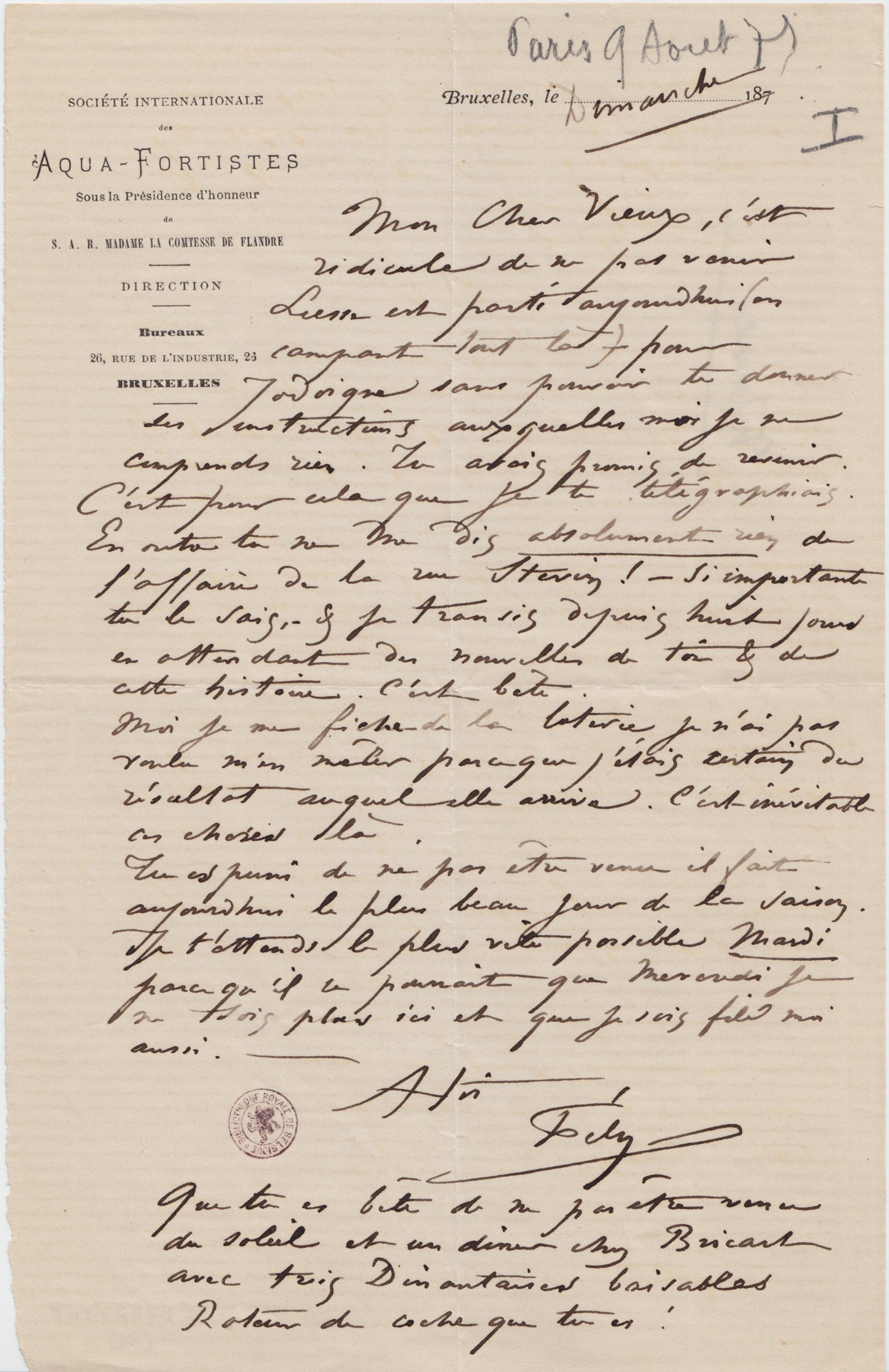 c’est ridicule de ne pas venir Liesse est parti aujourdhui (en campant tout là) – pour Jodoigne sans pouvoir te donner ses instructions auxquelles moi je ne comprends rien. Tu avais promis de revenir. C’est pour cela que je te télégraphiais. En outre tu ne me dis absolument rien de l’affaire de la rue Stevin ! – Si importante tu le sais, – & je transis depuis huit jours en attendant des nouvelles de toi & de cette histoire. C’est bête.
