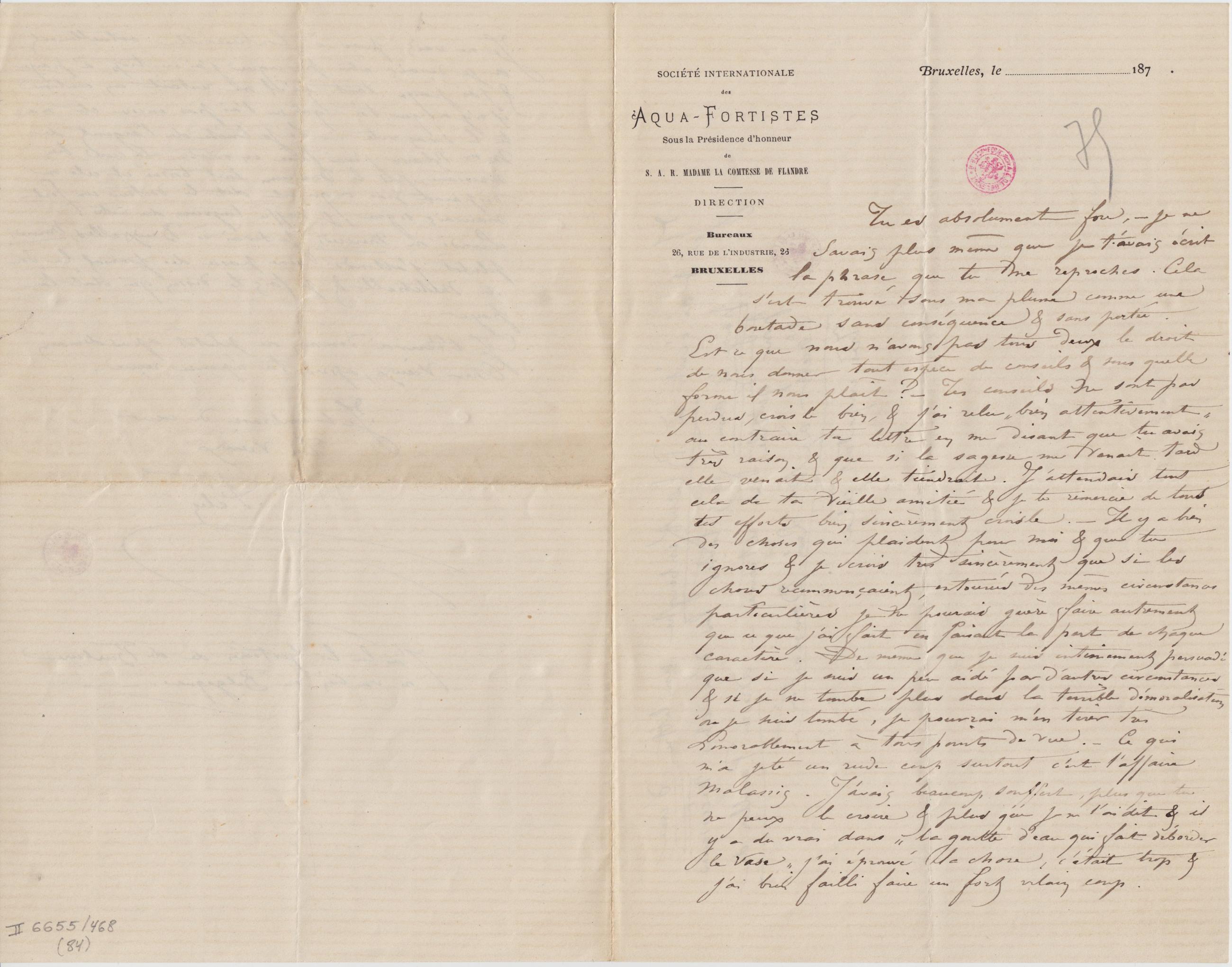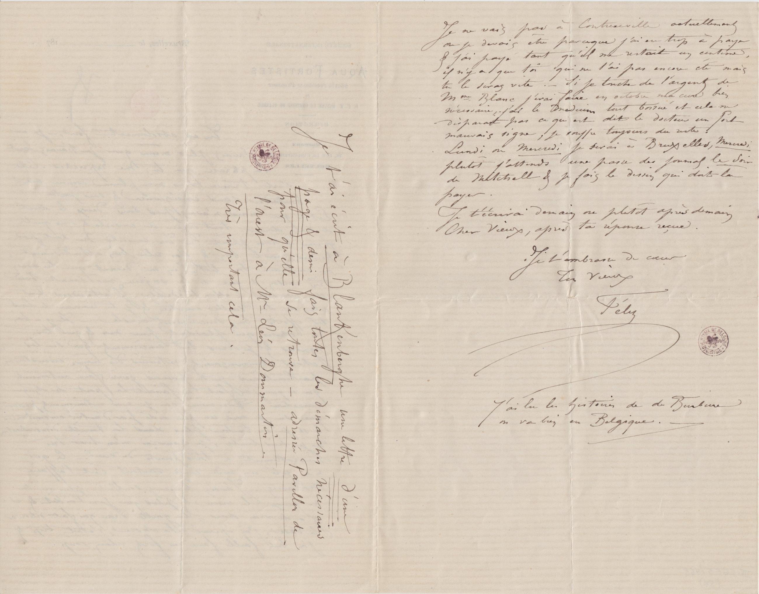 Tu es absolument fou, – je ne savais plus même que je t’avais écrit la phrase que tu me reproches. Cela s’est trouvé sous ma plume comme une boutade sans conséquence & sans portée. Est ce que nous n’avons pas tous deux le droit de nous donner tout espèce de conseils & sous quelle forme il nous plaît ? – Tes conseils ne sont pas perdus, crois le bien, & j’ai relu « bien attentivement » au contraire ta lettre en me disant que tu avais très raison & que si la sagesse me venait tard elle venait & elle tiendrait. J’attendais tout cela de ta vieille amitié & je te remercie de tous tes efforts bien sincèrement crois le. – Il y a bien des choses qui plaident pour moi & que tu ignores & je crois très sincèrement que si les choses recommençaient, entourées des mêmes circonstances particulières je ne pourais guère faire autrement que ce que j’ai fait en faisant la part de chaque caractère. De même que je suis intimement persuadé que si je suis un peu aidé par d’autres circonstances & si je ne tombe plus dans la terrible démoralisation où je suis tombé, je pourrai m’en tirer très honorablement à tous points de vue. – Ce qui m’a jeté un rude coup surtout c’est l’affaire Malassis. J’avais beaucoup souffert, plus que tu ne peux le croire & plus que je ne l’ai dit & il y a du vrai dans « la goutte d’eau qui fait déborder le vase » j’ai éprouvé la chose, c’était trop & j’ai bien failli faire un fort vilain coup.