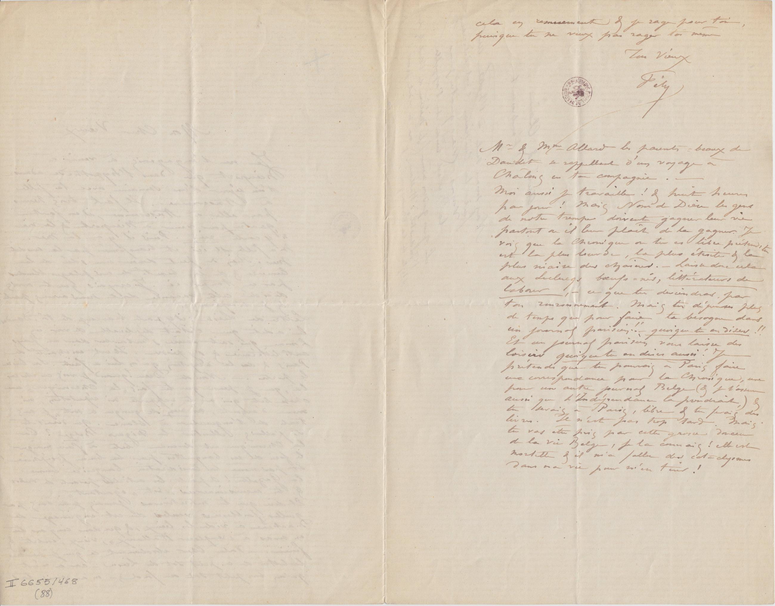 Lettre de Liesse : il y parle beaucoup de toi. Dom lui a dit que c’était déplorable de voir un homme qui sait écrire s’embourber dans un pays anti littéraire & s’y perdre. Il est enchanté de Paris & de la réception qu’on lui a faite. Son livre le porte. – Nom de Dieu ! quand je vois ces choses là, que je pense que tu fais « la Chronique » une chose bête qui ne te rapporte ni réputation, ni même d’argent, ni rien de quoique ce soit, je suis tenté de t’engueuler à blanc. Que dirais-tu si j’allais illustrer le Figaro Belge ? Car la Chronique est devenue bête à faire manger le foin de ses banquettes par la bonne Joséphine. Et pas même la Considération bourgeoise comme la Gazette ! À part les articles pesants de Vrebos & tes excursionneries, c’est « égoutant ».