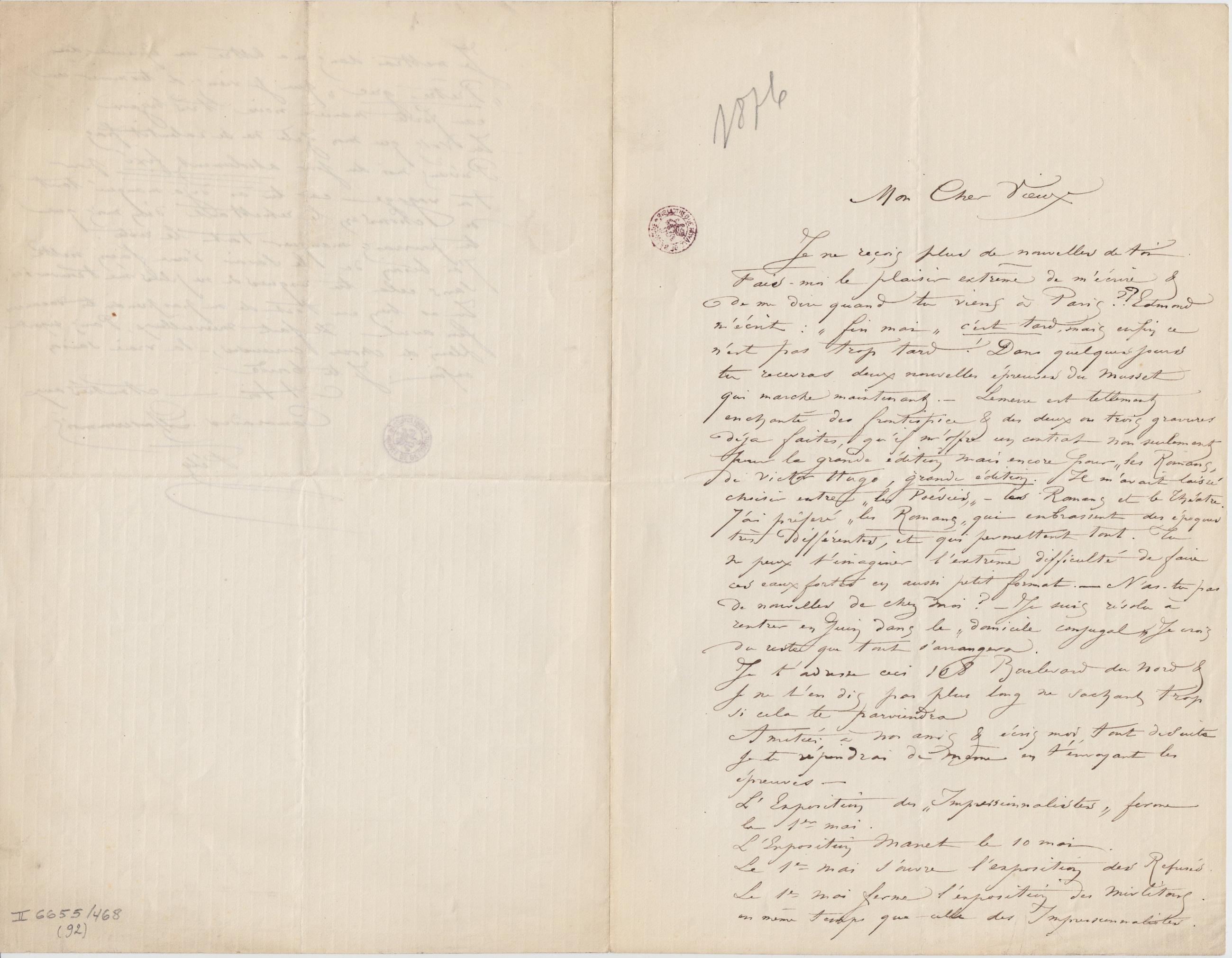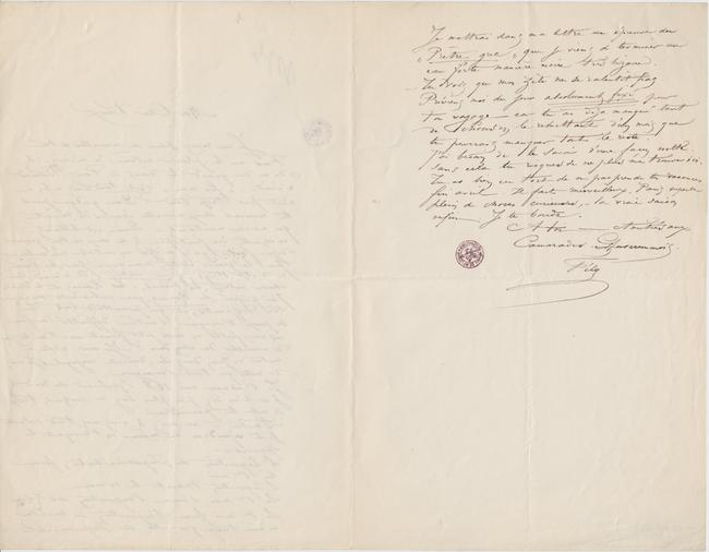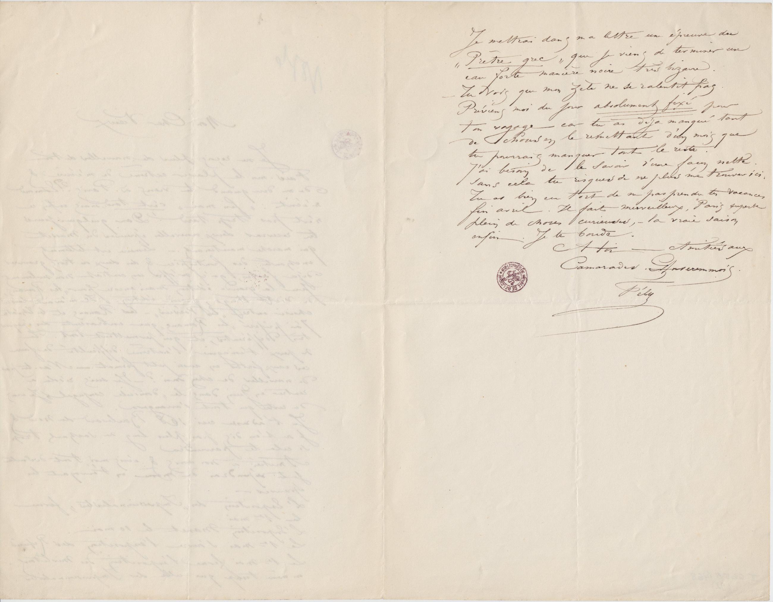 Je ne reçois plus de nouvelles de toi. Fais-moi le plaisir extrême de m’écrire & de me dire quand tu viens à Paris ?? Edmond m’écrit : « fin mai » c’est tard, mais enfin ce n’est pas trop tard ! Dans quelques jours tu recevras deux nouvelles épreuves du
