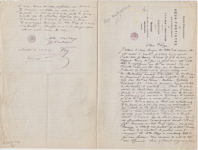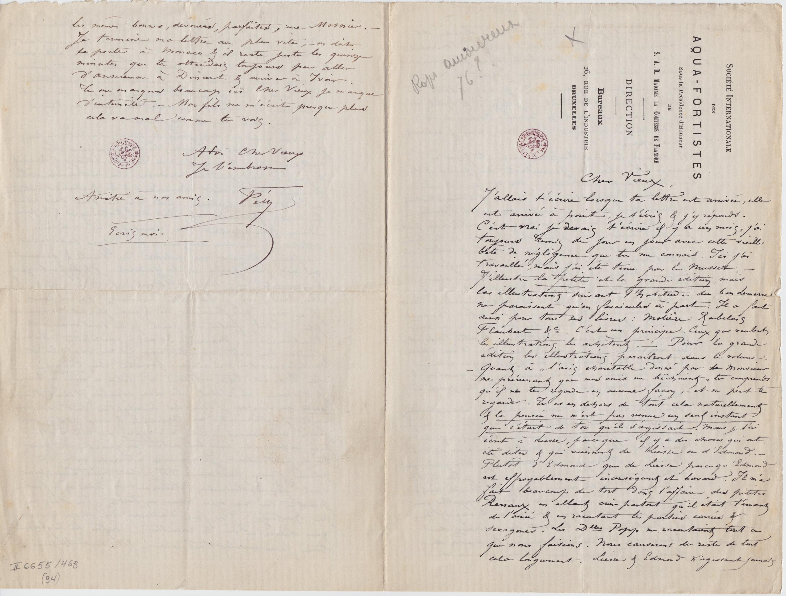 J’allais t’écrire lorsque ta lettre est arrivée, elle est arrivée à point, je t’écris & j’y réponds. C’est vrai je devais t’écrire il y a un mois, j’ai toujours remis de jour en jour avec cette vieille bête de négligence que tu me connais. Ici j’ai travaillé, mais j’ai été tenu par le Musset. – J’illustre la petite et la grande édition. mais les illustrations suivant l’habitude du bon Lemerre ne paraissent qu’en fascicules à part. Il a fait ainsi pour tous ses livres : Molière Rabelais Flaubert &c. C’est un principe. Ceux qui veulent les illustrations les achètent. – Pour la grande édition les illustrations paraîtront dans le volume. – Quant à « l’avis charitable donné par le Monsieur me prévenant que mes amis me bêchaient » tu comprends qu’il ne te regarde en aucune façon, – et ne peut te regarder. Tu es en dehors de tout cela naturellement & la pensée ne m’est pas venue un seul instant que c’était de toi qu’il s’agissait. Mais je l’ai écrit à Liesse, parce que il y a des choses qui ont été dites & qui viennent de Liesse ou d’Edmond. – Plutôt d’Edmond que de Liesse parce qu’Edmond est effroyablement inconséquent et bavard. Il m’a fait beaucoup de tort dans l’affaire des petites Renaux en allant crier partout qu’il était l’amant de l’ainée & en racontant les parties carrées & sexagones. Les Dlles
