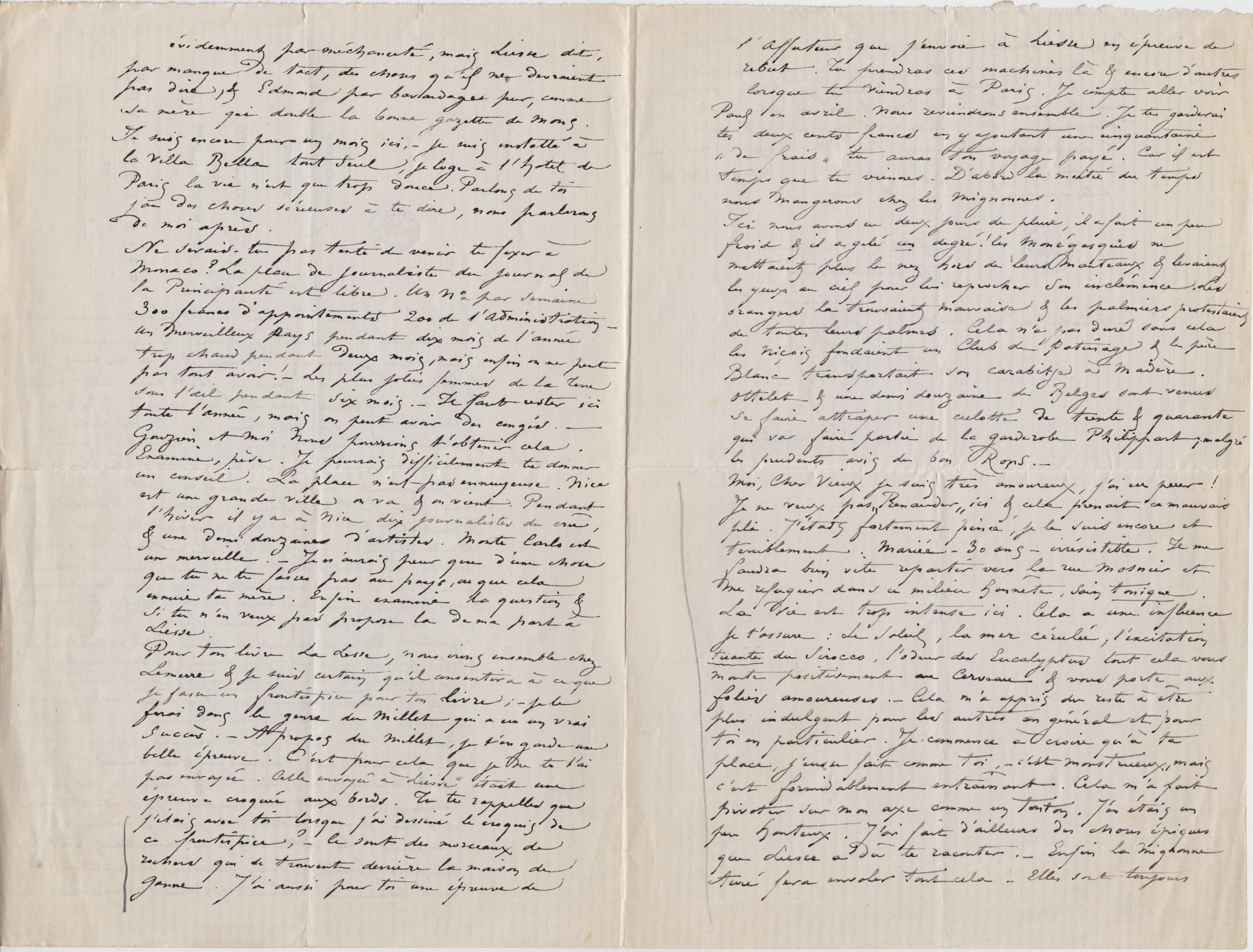 Ne serais-tu pas tenté de venir te fixer à Monaco ? La place de journaliste du journal de la Principauté est libre. Un n° par semaine 300 frs d’appointements 200 de l’administration – Un merveilleux pays pendant dix mois de l’année trop chaud pendant deux mois, mais enfin on ne peut pas tout avoir ! – Les plus jolies femmes de la terre sous l’œil pendant six mois. – Il faut rester ici toute l’année, mais on peut avoir des congés. – Gouzien et moi nous pourrions t’obtenir cela. Examine, pèse. Je pourrais difficilement te donner un conseil. La place n’est pas ennuyeuse. Nice est une grande ville on va & on vient. Pendant l’hiver il y a à Nice dix journalistes du crû, & une demi douzaine d’artistes. Monte Carlo est une merveille. – Je n’aurais peur que d’une chose que tu ne te fasses pas au pays, ou que cela ennuie ta mère. Enfin examine la question & si tu n’en veux pas propose la de ma part à Liesse.