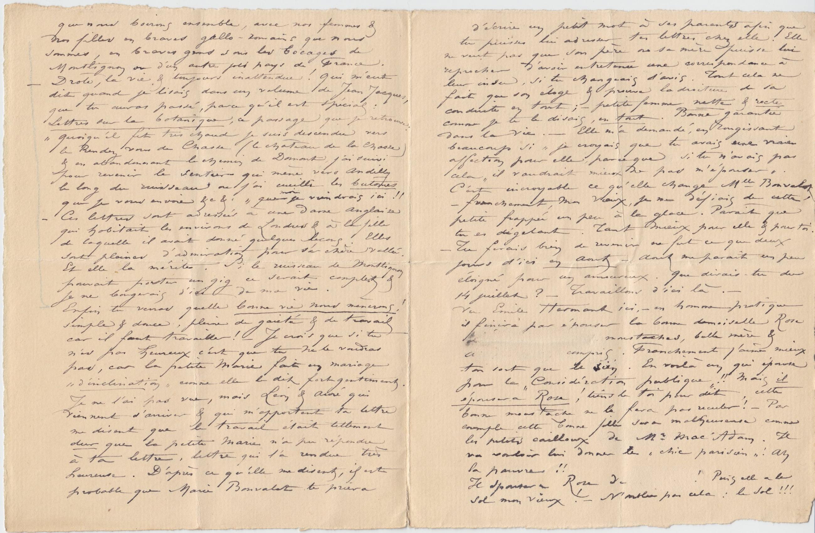 que nous boirons ensemble, avec nos femmes & nos filles en braves gallo-romains que nous sommes, en braves gens sous les bocages de Montlignon ou d’un autre joli pays de France. – Drôle, la vie & toujours inattendue ! Qui m’eut dit quand je lisais dans un volume de Jean Jacques, que tu auras passé, parce qu’il est spécial : Lettres sur la botanique, ce passage que je retrouve : « quoiqu’il fit très chaud je suis descendu vers le Rendez vous de Chasse (le château de la Chasse) & en abandonnant le chemin de Domont, j’ai suivi pour revenir le sentier qui mène vers Andilly le long du ruisseau où j’ai cueilli les butômes que je vous envoie &c &. » que moi je viendrais ici !! – Ces lettres sont adressées à une dame anglaise qui habitait les environs de Londres & à la fille de laquelle il avait donné quelques leçons. Elles sont pleines d’admiration pour sa chère vallée. Et elle la mérite. Si le ruisseau de Montlignon pouvait porter un gig ce serait complet & je ne bougerais d’ici de ma vie.