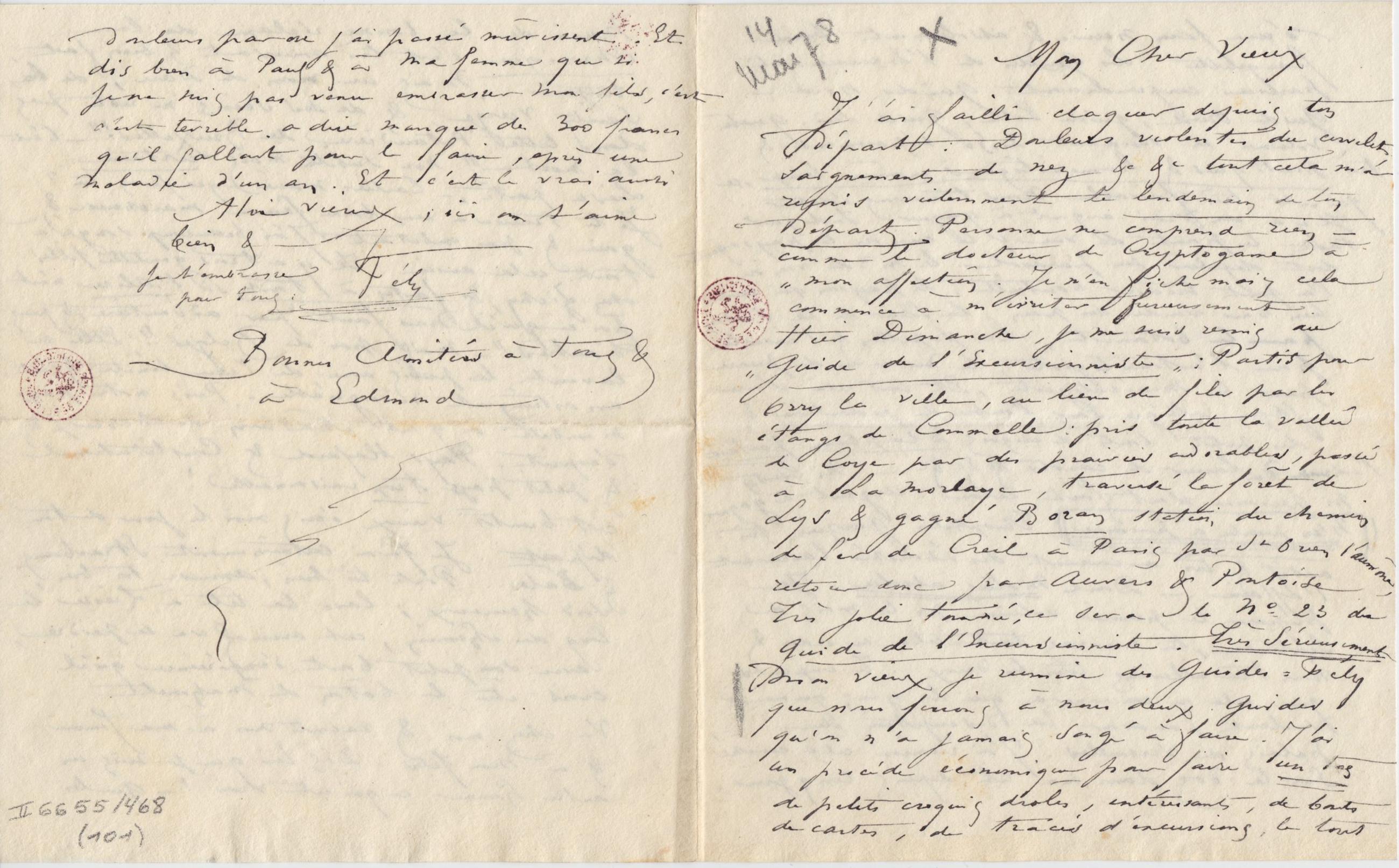 J’ai failli claquer depuis ton départ : Douleurs violentes du cervelet, saignements de nez &c &c tout cela m’a repris violemment le lendemain de ton départ. Personne ne comprend rien – comme le docteur de Cryptogame à « mon affection. Je m’en fiche mais cela commence à m’irriter furieusement. Hier Dimanche, je me suis remis au « Guide de l’Excursionniste » : Partis pour Orry la ville, au lieu de filer par les étangs de Commelle : pris toute la vallée de Coye par des prairies adorables, passé à La Morlaye, traversé la forêt de Lys & gagné Boran station, du chemin de fer de Creil à Paris par St Ouen l’aumône, retour donc par Auvers & Pontoise Très jolie tournée, ce sera le n° 23 du Guide de l’Excursionniste. Très sérieusementMon vieux je rumine des Guides-Fély que nous ferions à nous deux. Guides qu’on n’a jamais songé à faire. J’ai un procédé économique pour faire un tas de petits croquis drôles, intéressants, de bouts de cartes, de tracés d’excursions, le tout