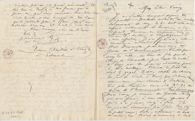 À bientôt vieux écris moi le jour de ton départ. Je ferai certainement Strasbourg & Bâle. Porte toi bien, amuse toi bien, sois heureux ; lave la tête à Liesse le long du chemin, cet animal va se perdre, avec son petit bout d’expérience qu’il croit être le bâton de Mahomet.