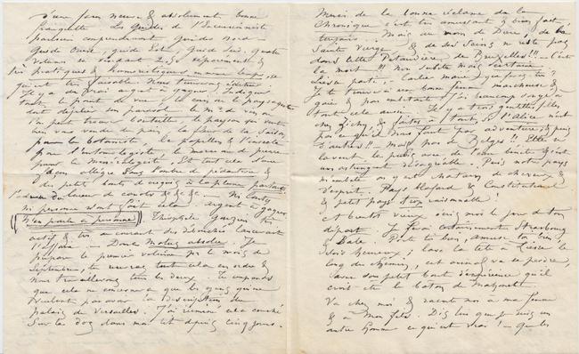 d’une facon neuve & absolument bonne franquette. Les Guides de l’Excursionniste parisien comprendraient guides Nord – guide Ouest, guide Est, guide Sud. Quatre volumes se vendant 2,50 séparément & très pratiques & humoristiques en même temps, ce qui est très faisable. Nous trouverons éditeur. Il y a du vrai argent à gagner. Indiquer tout le point de vue, le coin où le paysagiste doit déplier son parasol. le Md de vin où l’on peut trouver bouteille, le paysan qui veut bien vous vendre du pain, la fleur de la saison pour le botaniste, le papillon & l’insecte pour l’entomologiste, le morceau de pierre pour le minéralogiste. Et tout cela d’une façon allègre sans l’ombre de pédanterie & des petits bouts de croquis à la plumepartout. l’adresse du loueur de canots &c &c &c. – Ni Conty ni personne n’ont fait cela. Argent à gagner. N’en parle à personne. Théophile Gouzien très actif & très au courant des débouchés lancerait l’affaire. – Donc Motus absolu. Je prépare le premier volume pour le mois de Septembre, tu recevras tout cela en ordre & nous travaillerons tous les deux. Tu comprends que cela ne concernera que les gens qui ne veulent pas avoir la description du palais de Versailles. J’ai ruminé cela couché sur le dos dans mon lit depuis cinq jours.