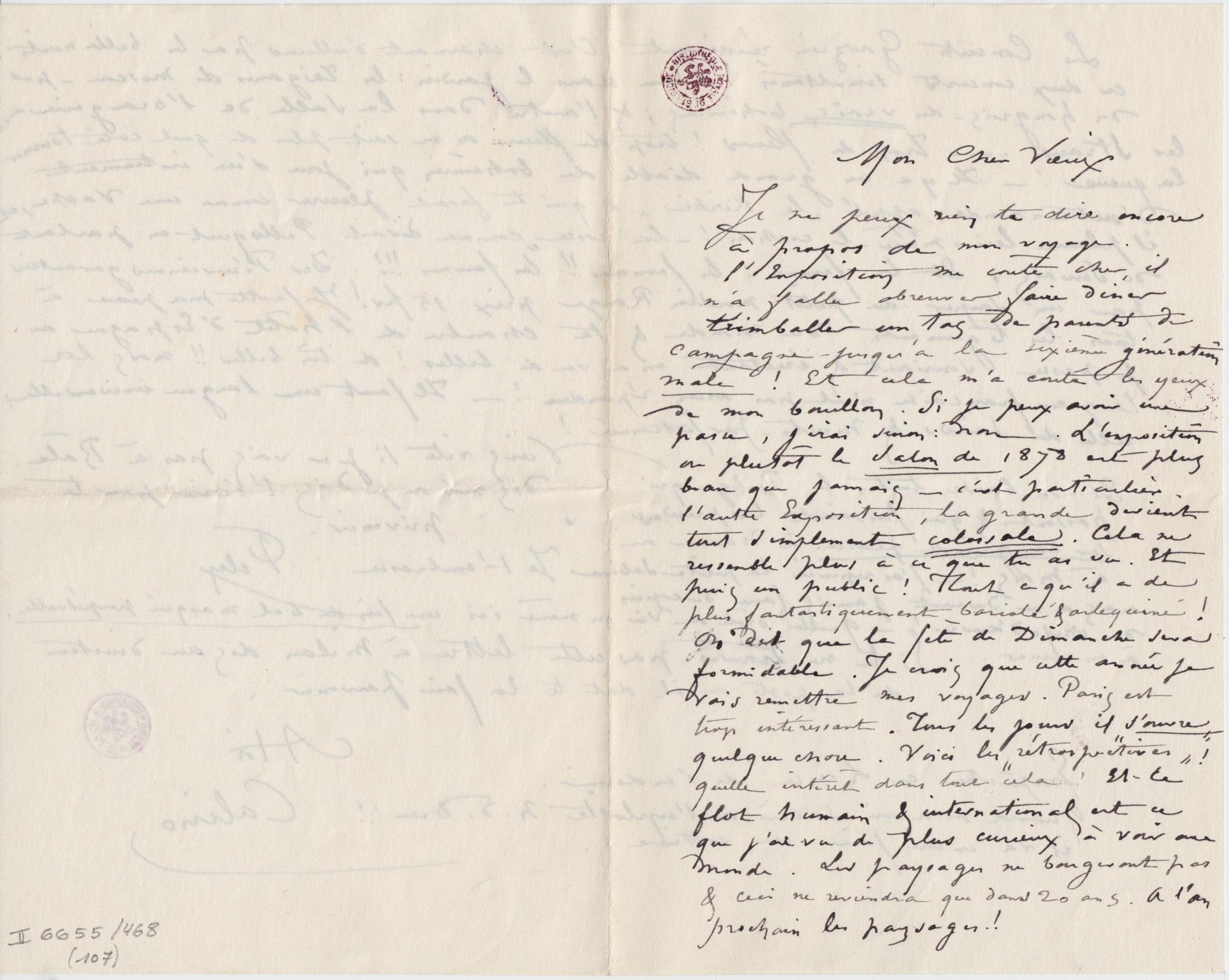 l’Exposition me coûte cher, il m’a fallu abreuver faire diner trimballer un tas de parents de campagne – jusqu'a la sixième génération mâle ! Et cela m’a couté les yeux de mon bouillon. Si je peux avoir une passe, j’irai sinon : non. L’exposition ou plutôt le Salon de 1878 est plus beau que jamais – c’est particulier. l’autre Exposition, la grande devient tout simplement colossale. Cela ne ressemble plus à ce que tu as vu. Et puis un public ! Tout ce qu’il a de plus fantastiquement bariolé & arlequiné ! On dit que la fête de Dimanche sera formidable. Je crois que cette année je vais remettre mes voyages. Paris est trop intéressant. Tous les jours il « s’ouvre » quelque chose. Voici les « rétrospectives » ! quelle intérêt dans tout cela ? Et ce flot humain & international est ce que j’ai vu de plus curieux à voir au monde. Les paysages ne bougeront pas & ceci ne reviendra que dans 20 ans. À l’an prochain les paysages. !