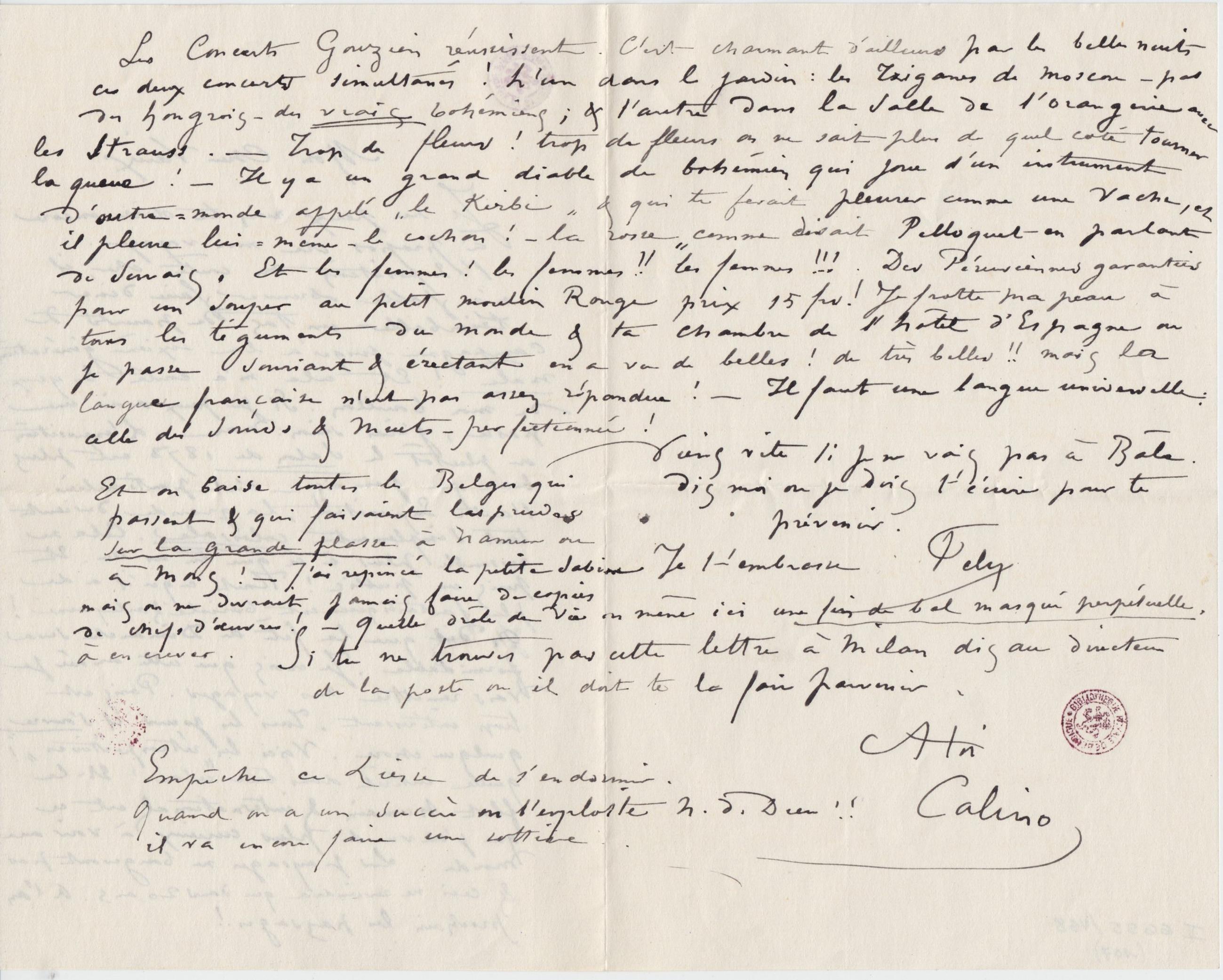 Les Concerts Gouzien réussissent. C’est charmant d’ailleurs par les belles nuits ces deux concerts simultanés ! L’un dans le jardin : les Tziganes de Moscou – pas des hongrois – des vrais bohémiens ; & l’autre dans la Salle de l’Orangerie avec les Strauss. – Trop de fleurs ! trop de fleurs on ne sait plus de quel coté tourner la queue ! – Il y a un grand diable de bohémien qui joue d’un instrument d’outre-monde appelé « le Kirbi » & qui te ferait pleurer comme une vache, et il pleure lui-même – le cochon ! – la rosse » comme disait Pelloquet – en parlant de Servais. Et les femmes ! les femmes !! les femmes !!! Des Péruviennes garanties pour un souper au petit moulin Rouge prix 15 frs ! Je frotte ma peau à tous les téguments du monde & ta chambre de l’hôtel d’Espagne où je passe souriant & érectant en a vu de belles ! de très belles !! mais la langue française n’est pas assez répandue ! – Il faut une langue universelle : celle des sourds & muets – perfectionnée !