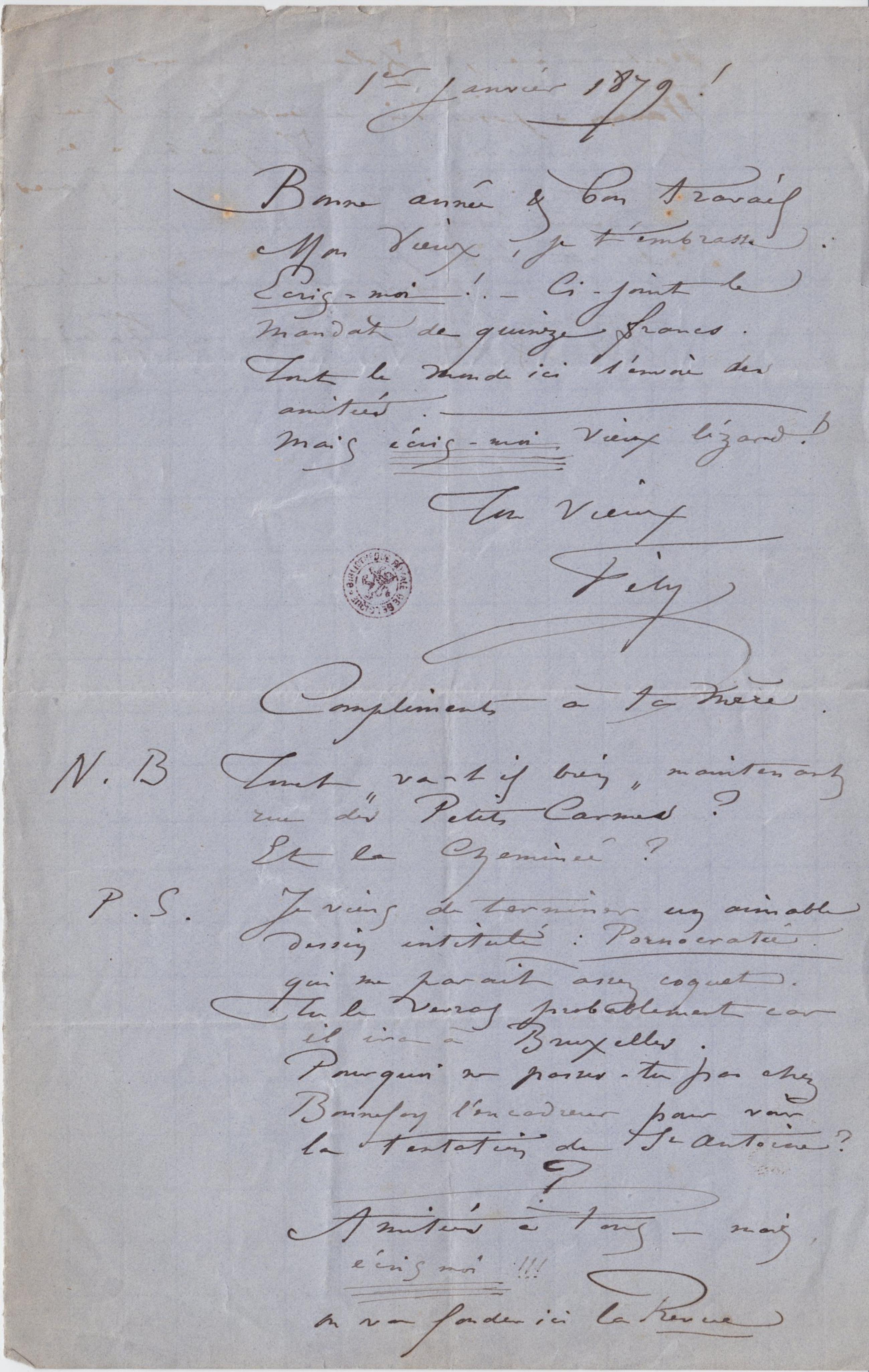 Bonne année & bon travail Mon Vieux, je t’embrasse. Écris-moi !. – Ci-joint le mandat de quinze francs. Tout le monde ici t’envoie des amitiés. –