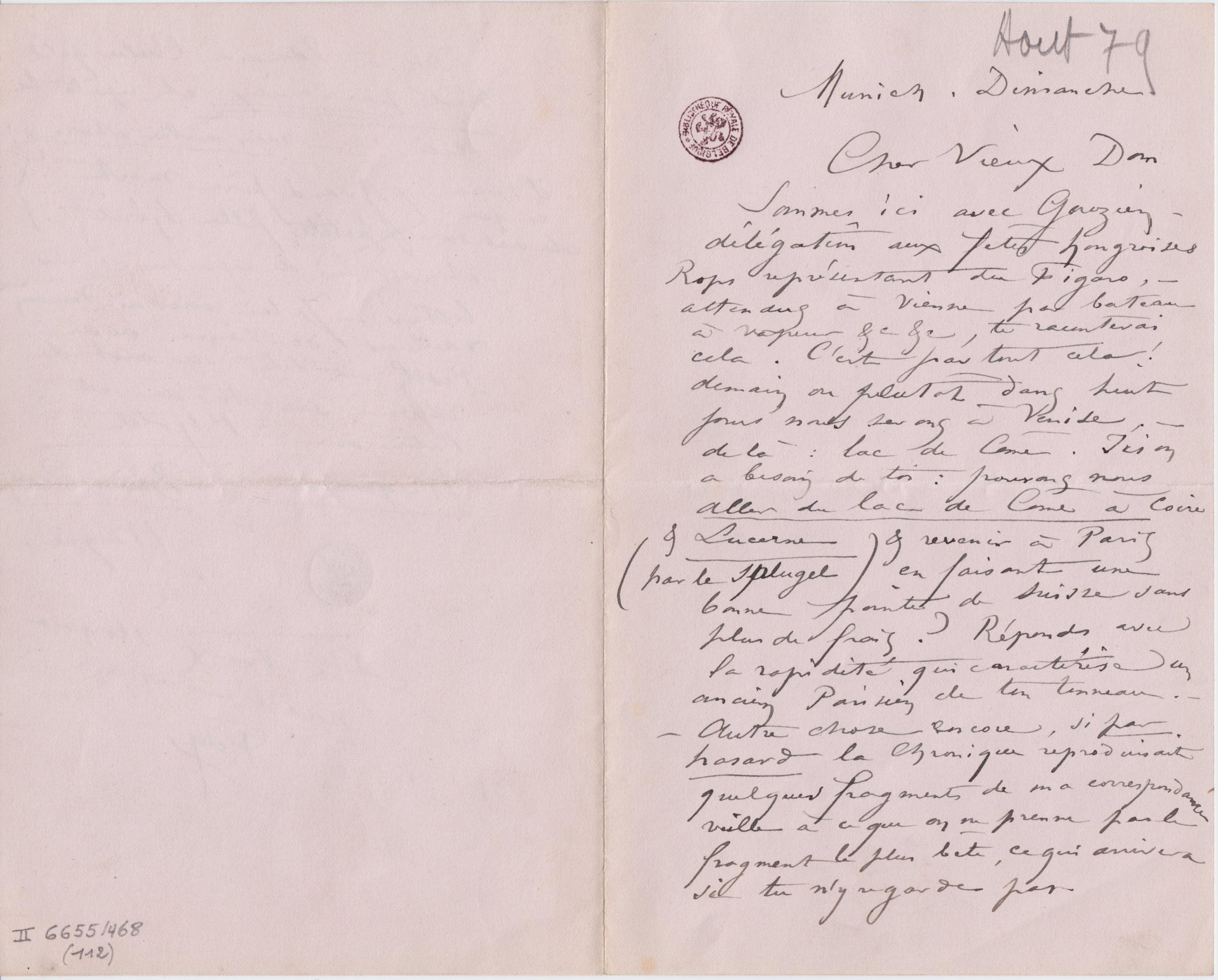 Sommes ici avec Gouzien – délégation aux fêtes hongroises Rops représentant du Figaro, – attendus à Vienne par bateau à vapeur &c &c, te raconterai cela. C’est pas tout cela ! demain ou plutôt dans huit jours nous serons à Venise, – de là : lac de Côme. Ici on a besoin de toi : pouvons nous aller du lac de Côme àCoire (& Lucerne par le Splugel) & revenir à Paris en faisant une bonne pointe de Suisse sans plus de frais ? Réponds avec la rapidité qui caractérise un ancien Parisien de ton tonneau. –