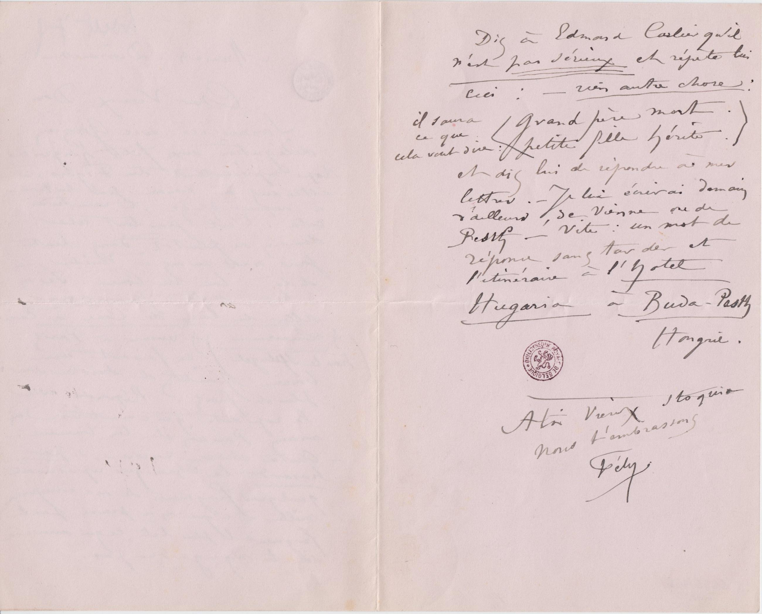 Dis à Edmond Carlier qu’il n’est pas sérieux et répète lui ceci : – rien autre chose : il saura ce que cela veut dire : (Grand père mort. petite fille hérite.) et dis lui de répondre à mes lettres. – Je lui écrirai demain d’ailleurs, de Vienne ou de Pesth – Vite : un mot de réponse sans tarder et l’itinéraire à l’hotel Hugaria à Buda-PesthHongrie.