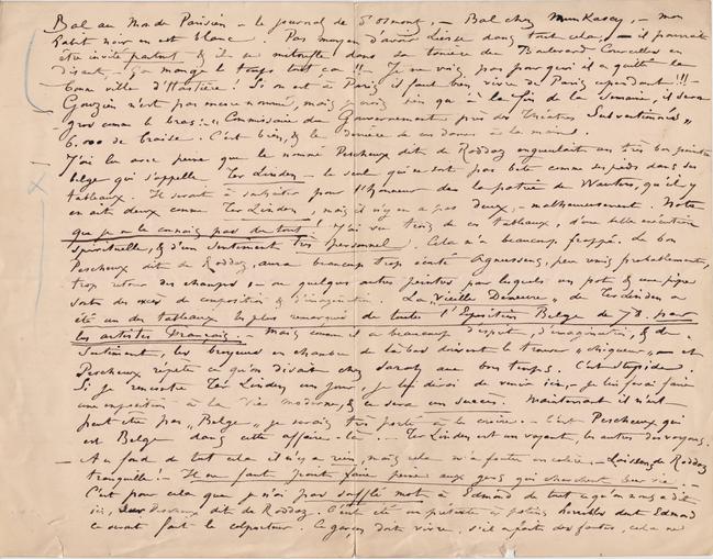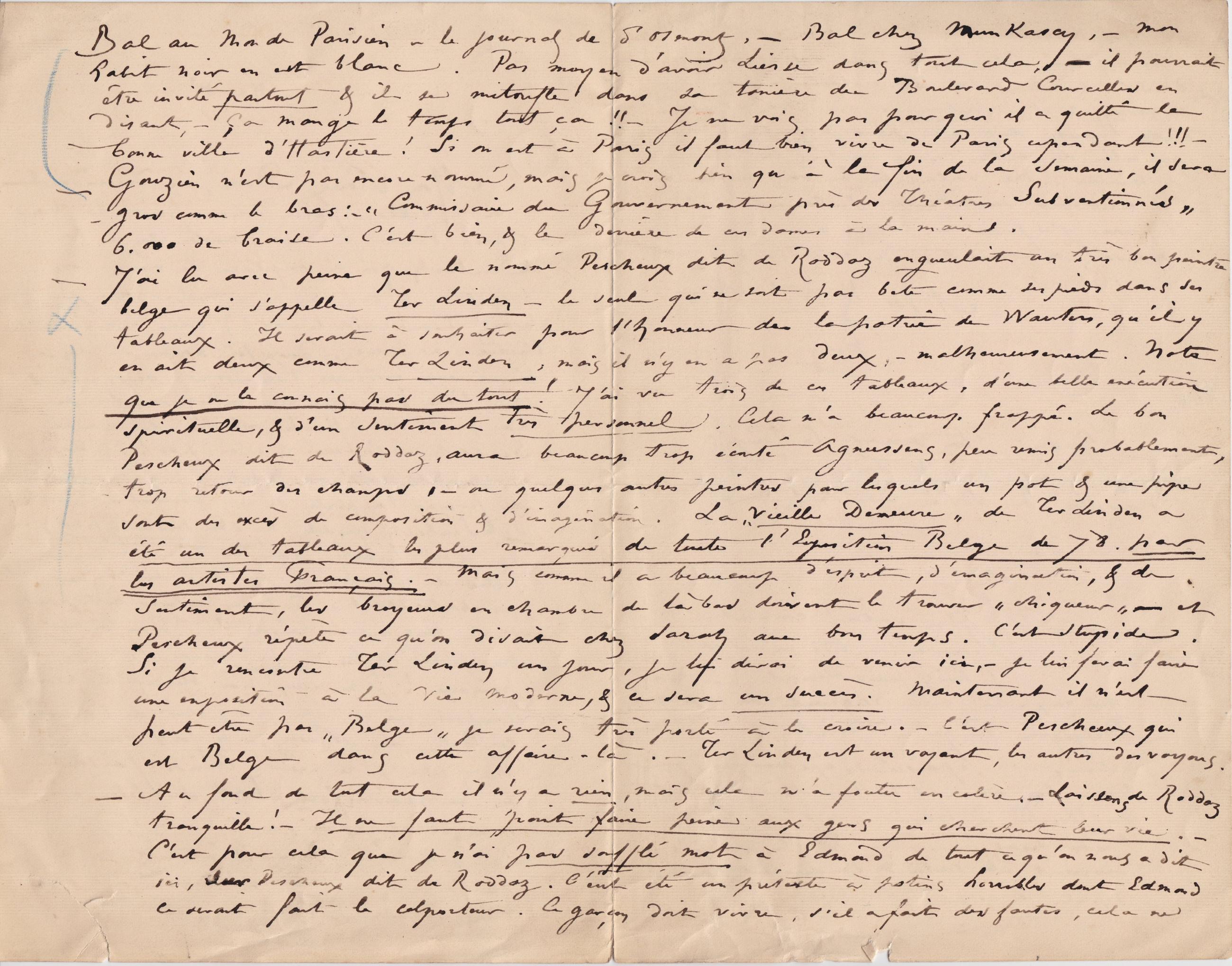 – J’ai lu avec peine que le nommé Pescheux dit de Roddaz engueulait un très bon peintre belge qui s’appelle Ter Linden – le seul qui ne soit pas bête comme ses pieds dans ses tableaux. Il serait à souhaiter pour l’honneur de la patrie de Wauters, qu’il y en ait deux comme Ter Linden, – mais il n’y en a pas deux, – malheureusement. Note que je ne le connais pas du tout ! J’ai vu trois de ces tableaux, d’une belle exécution spirituelle, & d’un sentiment très personnel. Cela m’a beaucoup frappé. Le bon Pescheux dit de Roddaz, aura beaucoup trop écouté Agneessens, peu remis probablement, trop retour des champs, – ou quelques autres peintres pour lesquels un pot & une pipe sont des excès de composition & d’imagination. La « Vieille Demeure » de Ter Linden a été un des tableaux les plus remarqués de toute l’Exposition Belge de 78. par les artistes Français. – Mais comme il a beaucoup d’esprit, d’imagination, & de sentiment, les broyeurs en chambre de là bas doivent le trouver « chiqueur » – et Pescheux répète ce qu’on disait chez Sarah au bon temps. C’est stupide. Si je rencontre Ter Linden un jour, je lui dirai de venir ici, – je lui ferai faire une exposition à la Vie Moderne, & ce sera un succès. Maintenant il n’est peut être pas « Belge » je serais très porté à le croire. – C’est Pescheux qui est Belge dans cette affaire-là. – Ter Linden est un voyant, les autres des voyous.