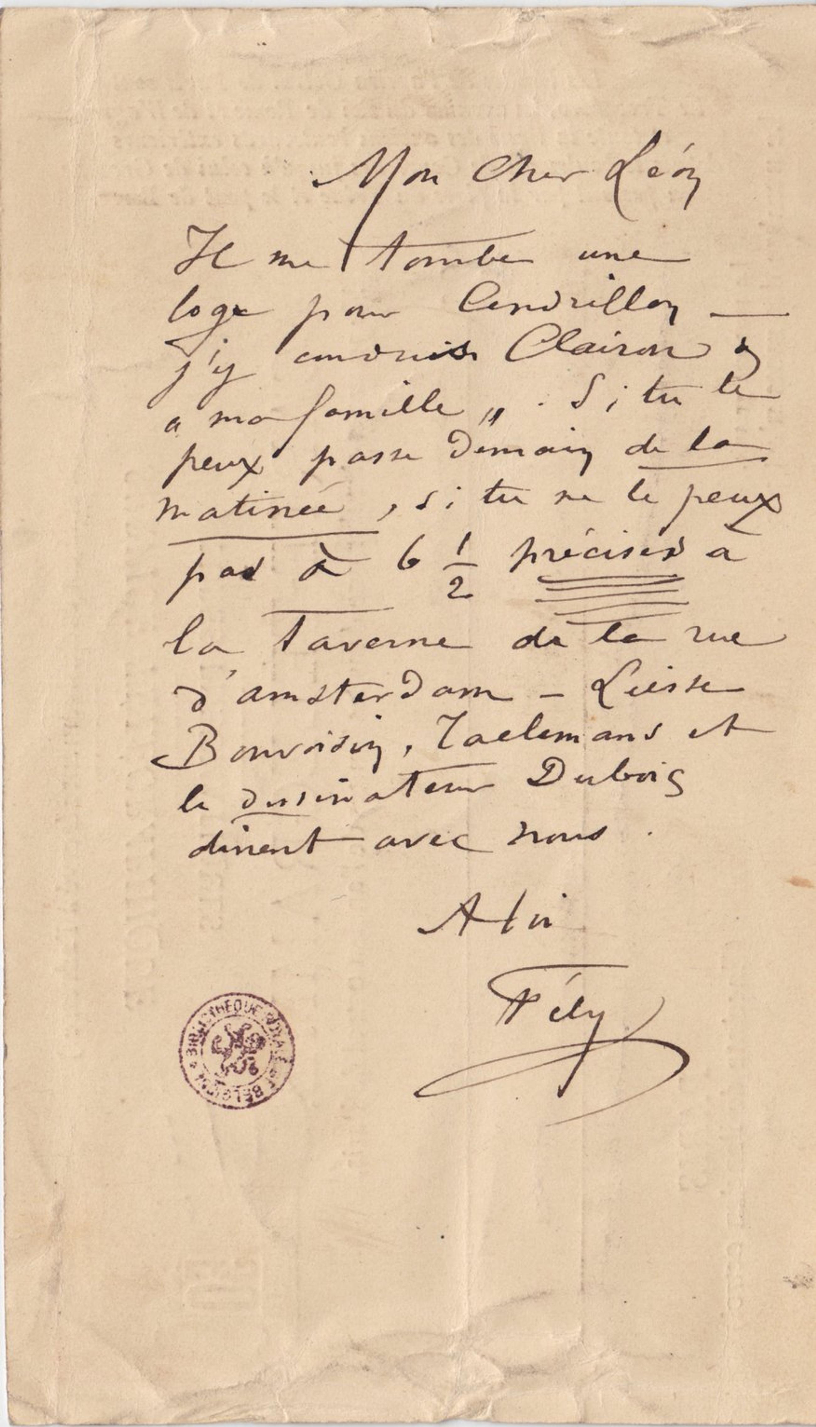Il me tombe une loge pour Cendrillon – j’y conduis Clairon & « ma famille ». Si tu le peux passe demain de la matinée, si tu ne le peux pas à 6 ½ précises à la taverne de la rue d’Amsterdam – Liesse Bonvoisin, Taelemans et le dessinateur Dubois dînent avec nous.