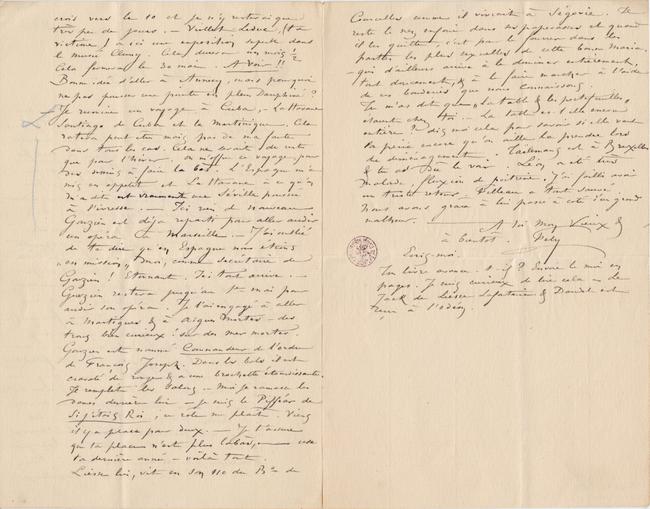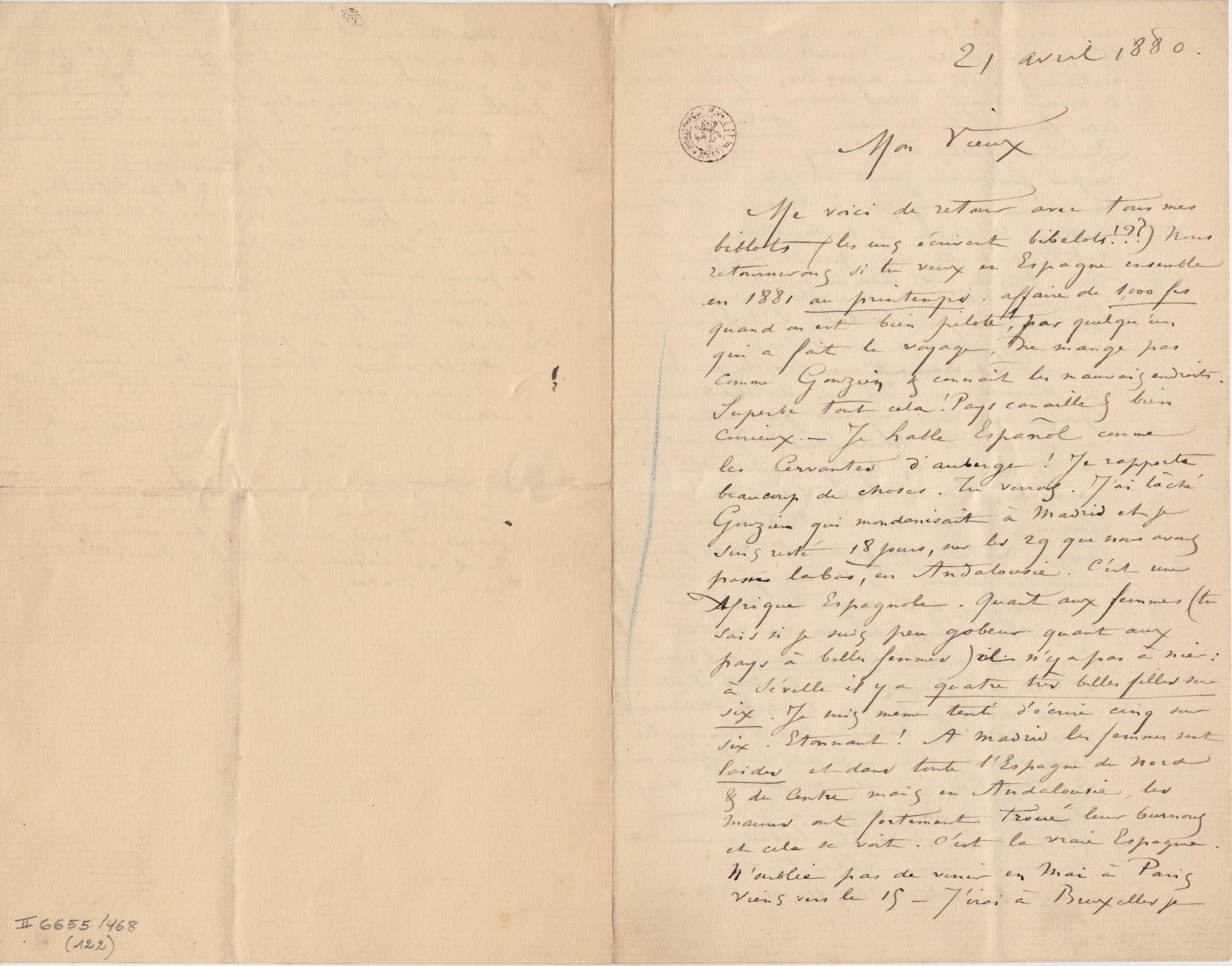 Me voici de retour avec tous mes biblots (les uns écrivent bibelots !??) Nous retournerons si tu veux en Espagne ensemble en 1881 au printemps. affaire de 1,000 frs quand on est bien piloté, par quelqu’un qui a fait le voyage, ne mange pas comme Gouzien & connaît les mauvais endroits. Superbe tout cela ! Pays canaille & bien curieux. – Je hable Español comme les Cervantes d’auberge ! Je rapporte beaucoup de choses. Tu verras. J’ai lâché Gouzien qui mondanisait à Madrid et je suis resté 18 jours, sur les 29 que nous avons passé labàs, en Andalousie. C’est une Afrique Espagnole. Quant aux femmes (tu sais si je suis peu gobeur quant aux pays à belles femmes) il n’y a pas à nier : à Séville il y a quatre très belles filles sur six. Je suis même tenté d’écrire cinq sur six. Étonnant ! À Madrid les femmes sont laides et dans toute l’Espagne du Nord & du Centre mais en Andalousie, les maures ont fortement troué leur burnous et cela se voit. C’est la vraie Espagne. N’oublie pas de venir en Mai à Paris Viens vers le 15 – J’irai à Bruxelles je