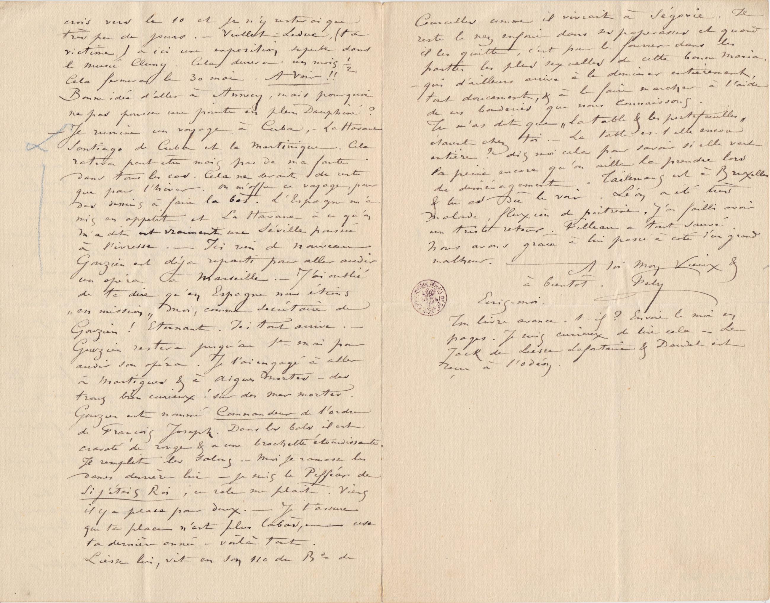 crois vers le 10 et je n’y resterai que très peu de jours. – Viollet-Leduc, (ta victime) a ici une exposition superbe dans le Musée Cluny. Cela durera un mois ½ Cela fermera le 30 mai. À voir !! Bonne idée d’aller à Annecy, mais pourquoi ne pas pousser une pointe en plein Dauphiné ? – Je rumine un voyage à Cuba, – La HavaneSantiago de Cuba et la Martinique. Cela ratera peut être mais pas de ma faute dans tous les cas. Cela ne serait du reste que pour l’hiver. On m’offre ce voyage, pour des dessins à faire la bàs. L’Espagne m’a mis en appétit et La Havane à ce qu’on m’a dit est vraiment une Séville poussée à l’ivresse. – Ici rien de nouveau Gouzien est déja reparti pour aller audir un opéra à Marseille. – J’ai oublié de te dire qu’en Espagne nous étions « en mission » Moi, comme secrétaire de Gouzien ! Étonnant. Ici tout arrive. – Gouzien restera jusqu’au 1er mai pour audir son opéra. Je l’ai engagé à aller à Martigues & à Aigues Mortes – des trous bien curieux ! sur des mer mortes. Gouzien est nommé Commandeur de l’ordre de François Joseph. Dans les bals il est cravaté de rouge & a une brochette étourdissante. Il remplit les salons. – Moi je ramasse les dames derrière lui – je suis le Pifféar de Si j’étais Roi, ce rôle me plaît. Viens il y a place pour deux. – Je t’assure que ta place n’est plus labàs, – use ta dernière année – voilà tout.
