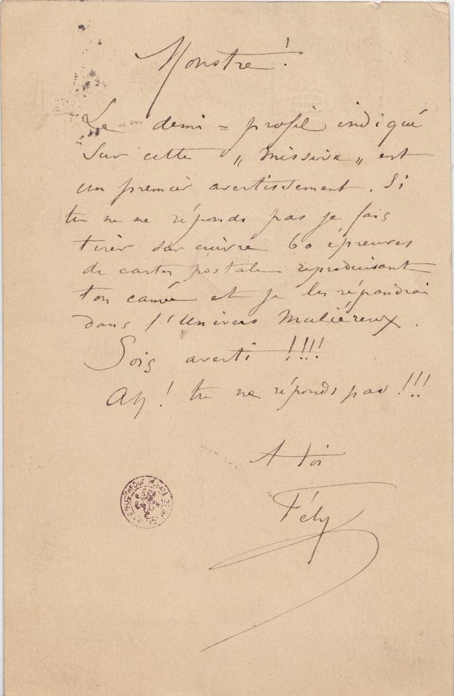 Le demi-profil indiqué sur cette « missive » est un premier avertissement. Si tu ne me réponds pas je fais tirer sur cuivre 60 épreuves de cartes postale reproduisant ton camée et je les répandrai dans l’Univers Muliéreux.