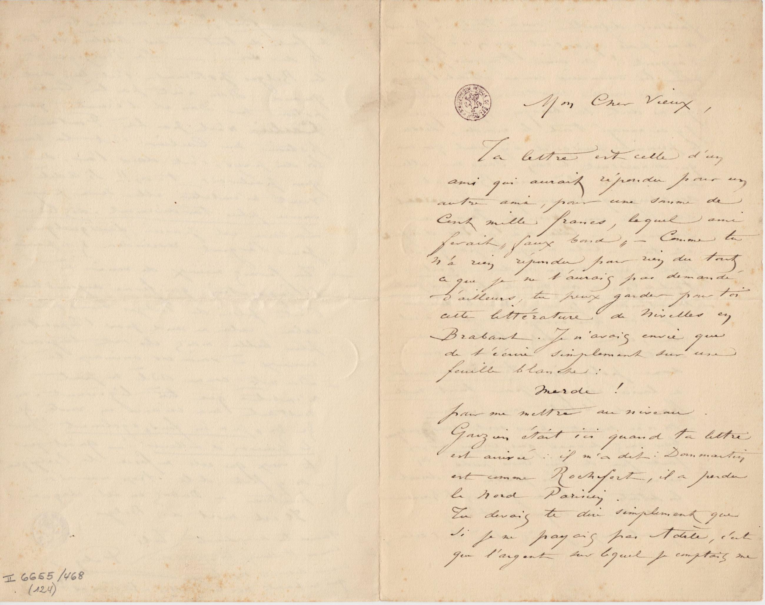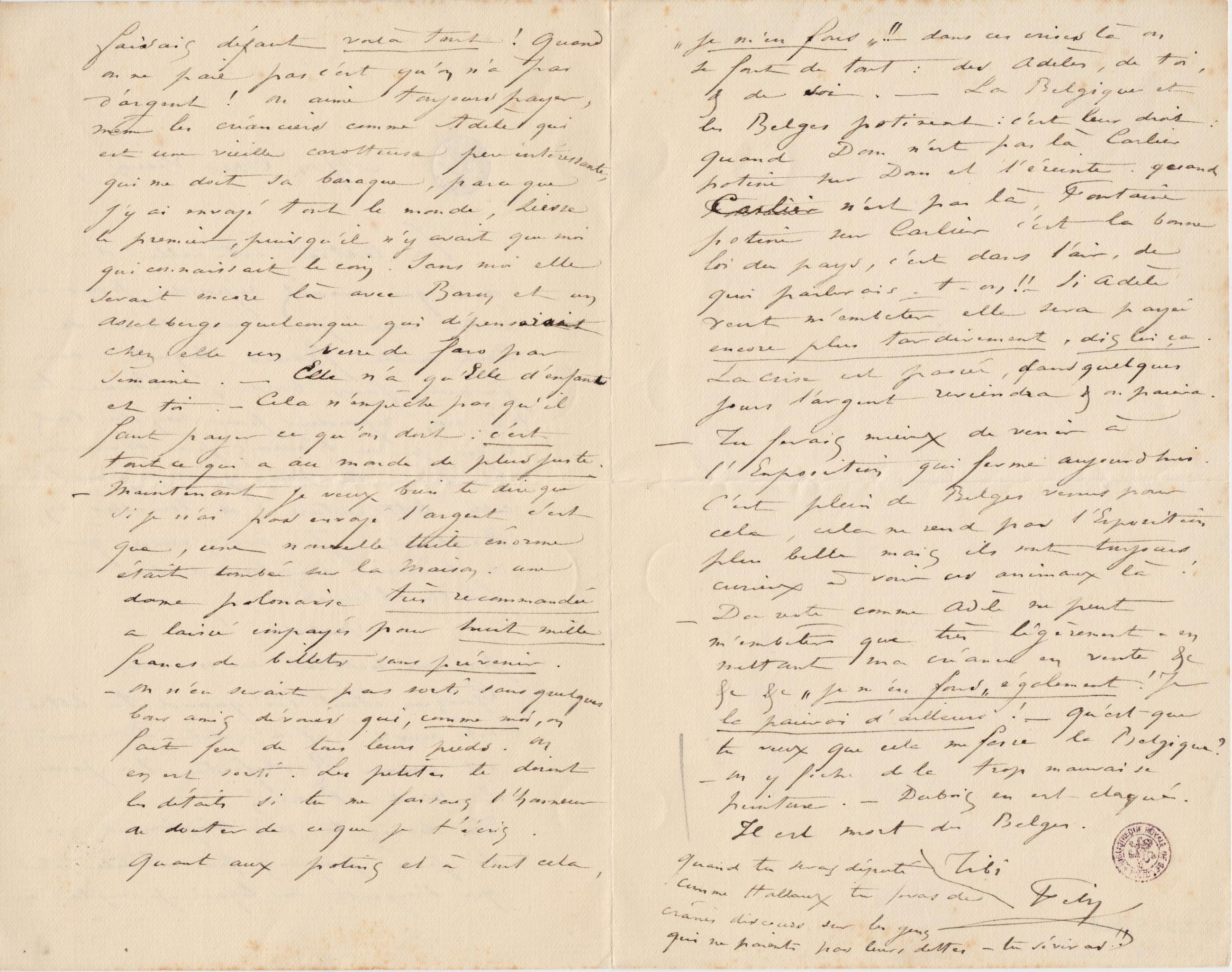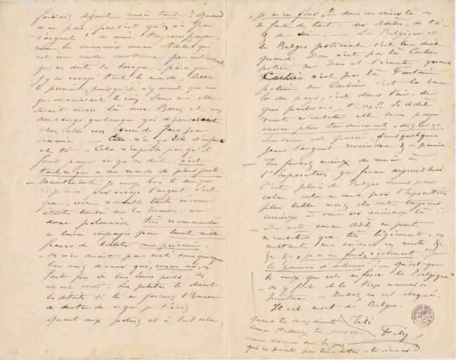 « je m’en fous » !! dans ces crises là on se fout de tout : des Adèles, de toi, & de soi. – La Belgique et les Belges potinent : c’est leur droit : quand Dom n’est pas là Carlier potine sur Dom et l’éreinte. quand Carlier n’est pas là, Fontaine potine sur Carlier c’est la bonne loi du pays, c’est dans l’air, de qui parlerais-t-on !! Si Adèle veut m’embêter elle sera payée encore plus tardivement, dis lui ça. La crise est passée, dans quelques jours l’argent reviendra & on paiera. – Tu ferais mieux de venir à l’Exposition qui ferme aujourdhui. C’est plein de Belges venus pour cela, cela ne rend pas l’Exposition plus belle mais ils sont toujours curieux à voir ces animaux là ! – Du reste comme Adèle ne peut m’embêter que très légèrement – en mettant ma créance en vente &c &c &c « je m’en fous » également ! Je la paierai d’ailleurs ! – Qu’est que tu veux que cela me fasse la Belgique ? – on y fiche de la trop mauvaise peinture. – Dubois en est claqué. Il est mort des Belges.