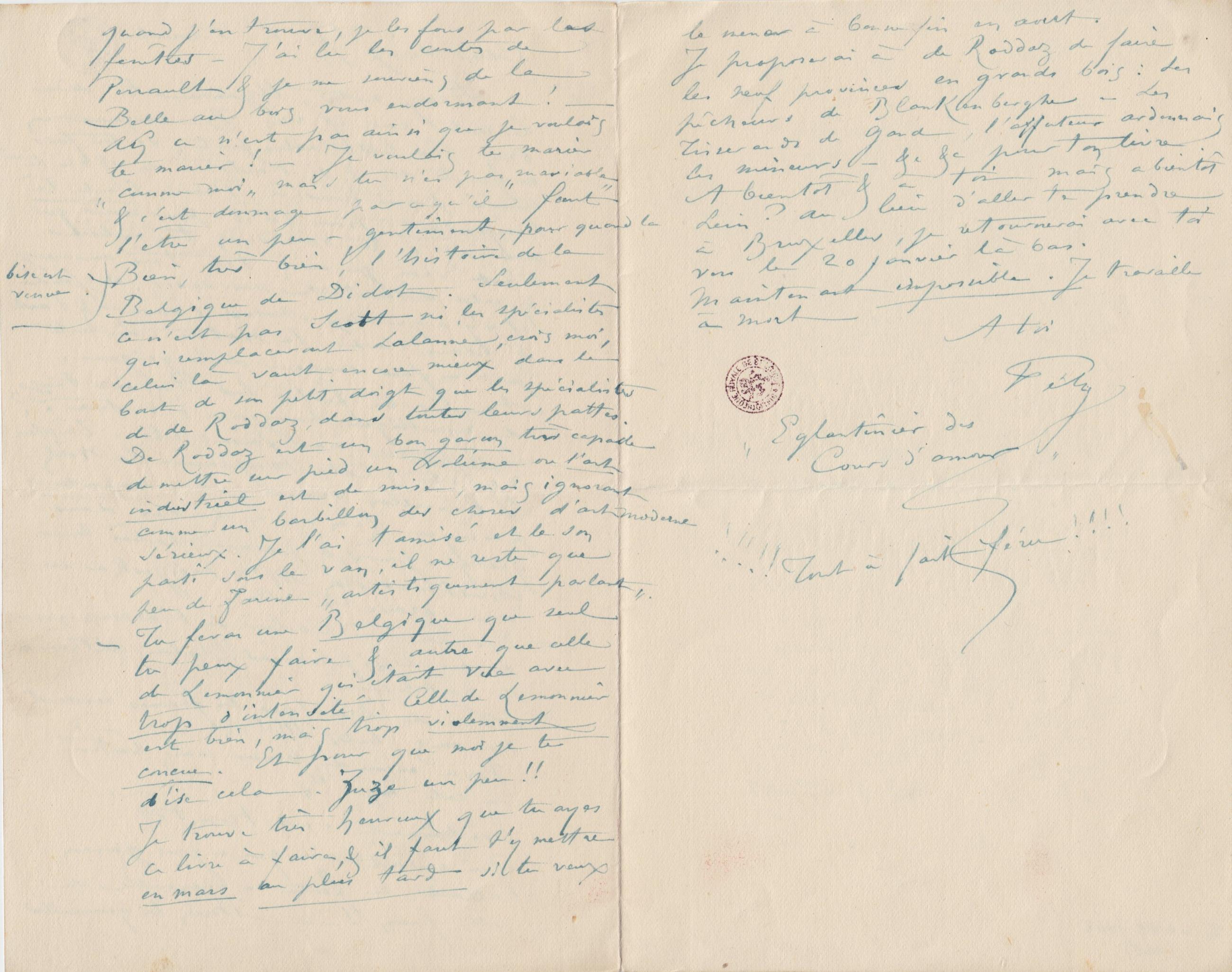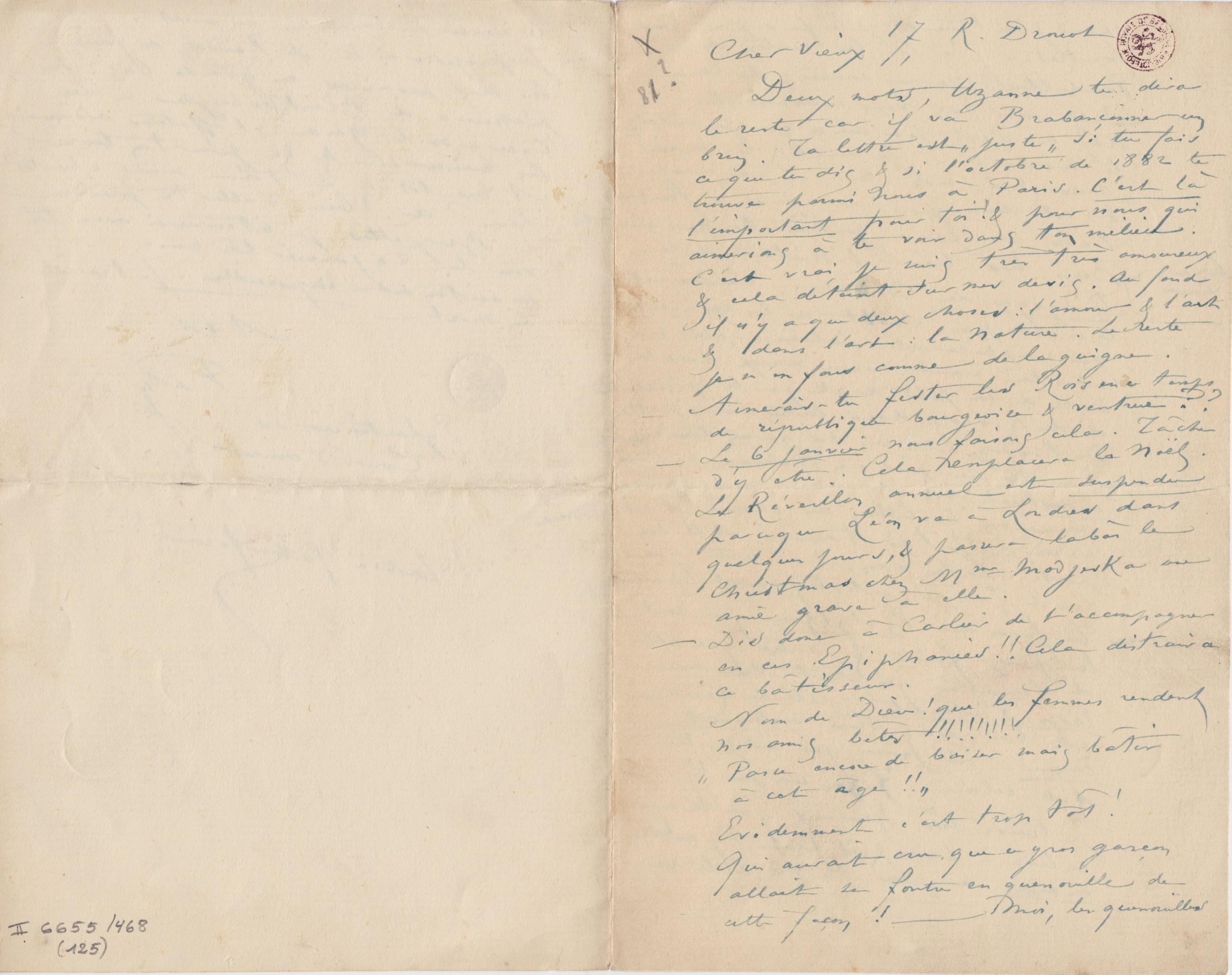 Deux mots, Uzanne te dira le reste car il va Brabançonner un brin. Ta lettre est « juste » si tu fais ce que tu dis & si l’octobre de 1882 te trouve parmi nous à Paris. C’est là l’important pour toi ! & pour nous qui aimerions à te voir dans ton milieu. C’est vrai je suis très très amoureux & cela déteint sur mes devis. Au fond il n’y a que deux choses : l’amour & l’art & dans l’art : la Nature. Le reste je m’en fous comme de la guigne. Aimerais-tu fester les Rois en ce temps de république bourgeoise & ventrue ?? – Le 6 janvier nous faisons cela. Tâche d’y être. Cela remplacera la Noël. Le Réveillon annuel est suspendu parce que Léon va à Londres dans quelques jours, & passera labàs le Christmas chez Mme Modjeska une amie grave à elle.