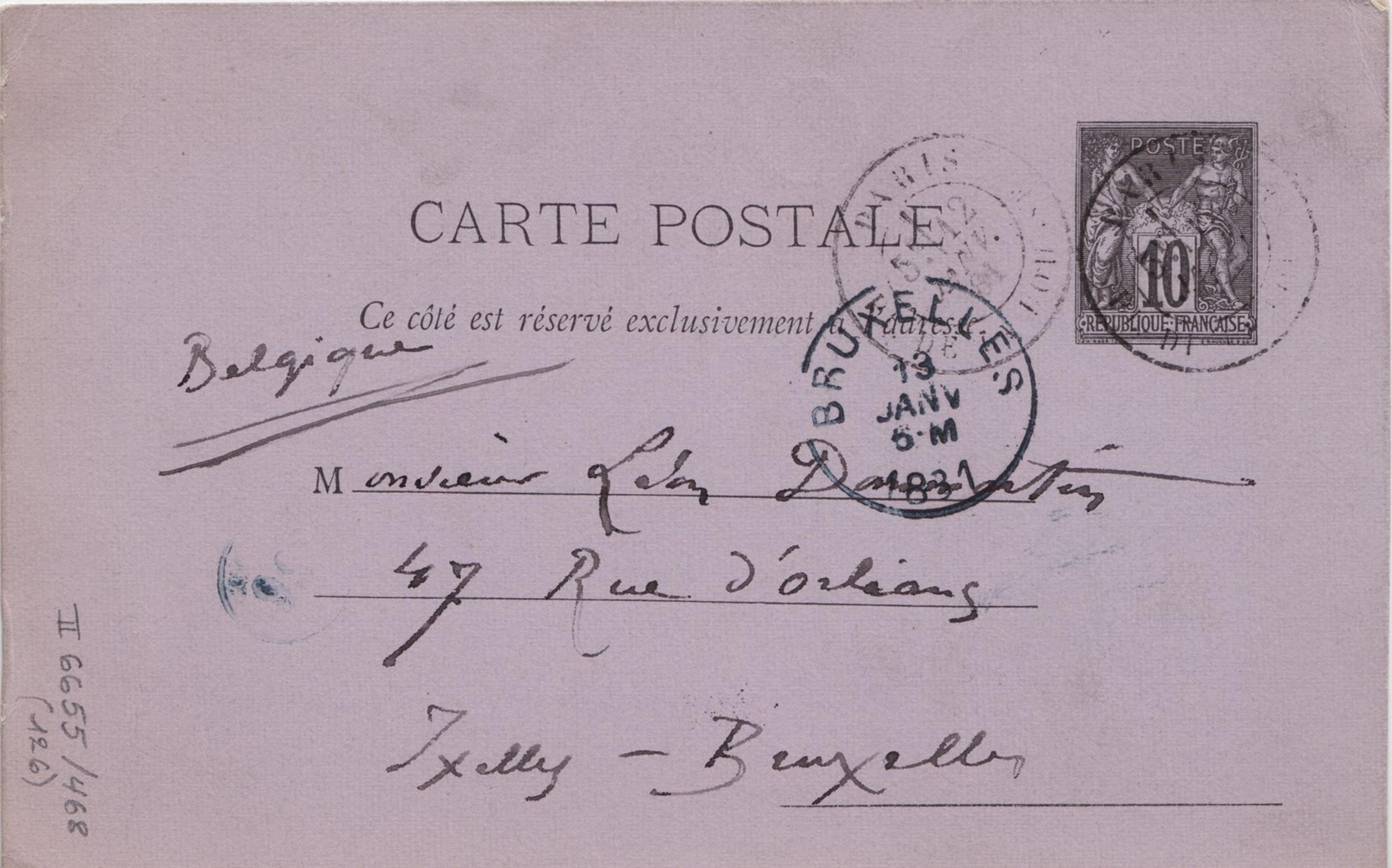 BelgiqueMonsieur Léon Dommartin47 Rue d’Orléans Ixelles-Bruxelles Page 1 Verso : 2