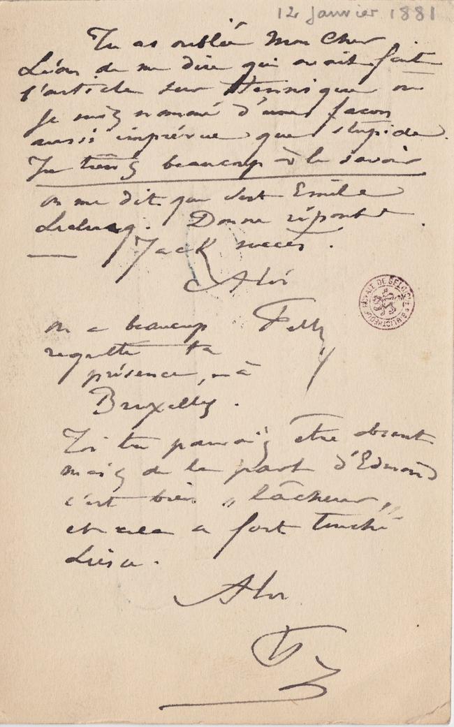 Tu as oublié Mon Cher Léon de me dire qui avait fait l’article sur Hennique où je suis nommé d’une facon aussi imprévue que stupide. Je tiens beaucoup à le savoir On me dit que c’est Émile Leclercq. Donne réponse.