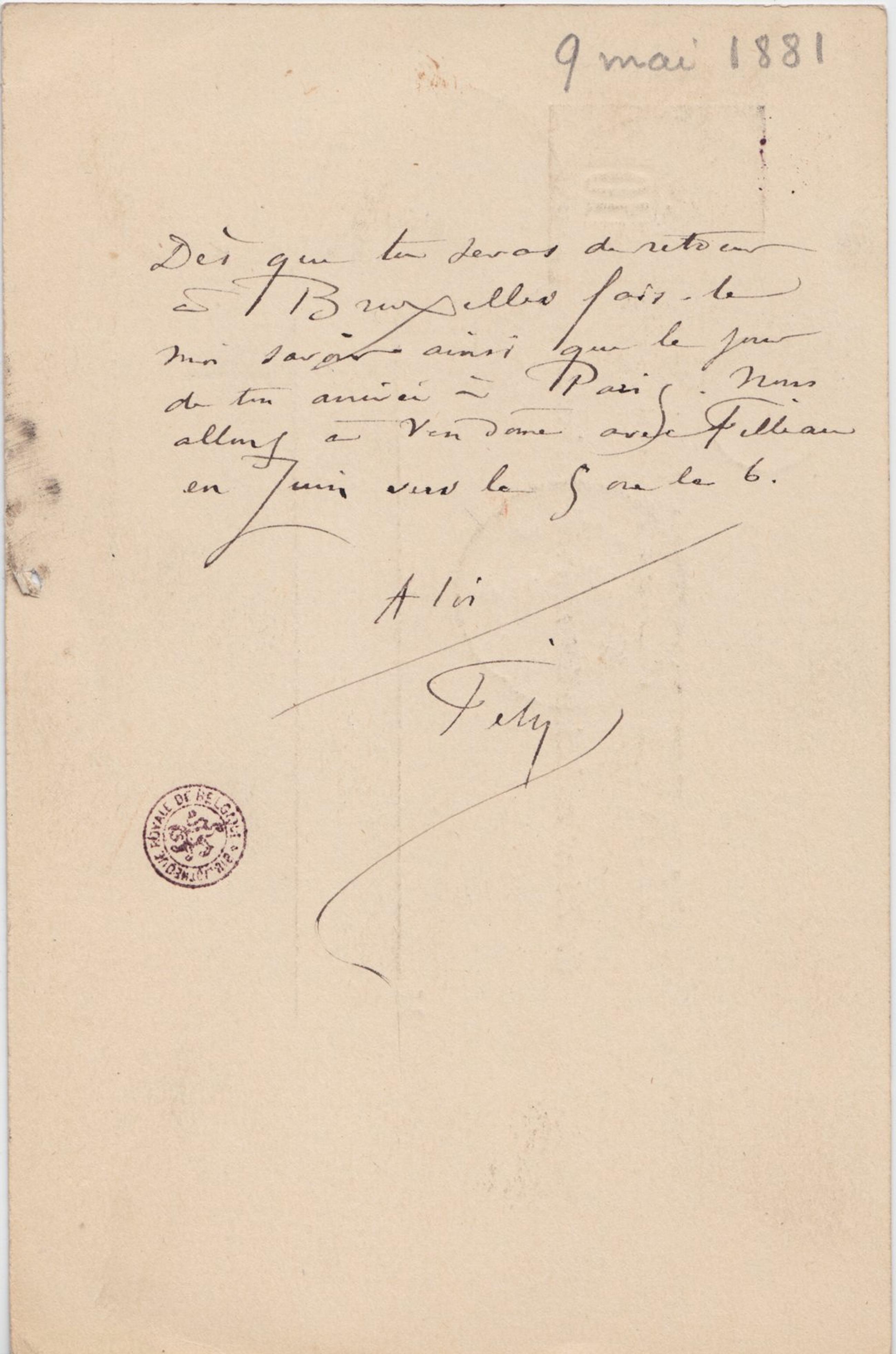 Dès que tu seras de retour à Bruxelles fais-le moi savoir ainsi que le jour de ton arrivée à Paris. Nous allons à Vendôme avec Filleau en Juin vers le 5 ou le 6.