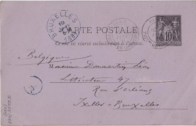Belgique Monsieur Dommartin Léon Littérateur47. Rue d’Orléans Ixelles-Bruxelles Page 1 Verso : 2