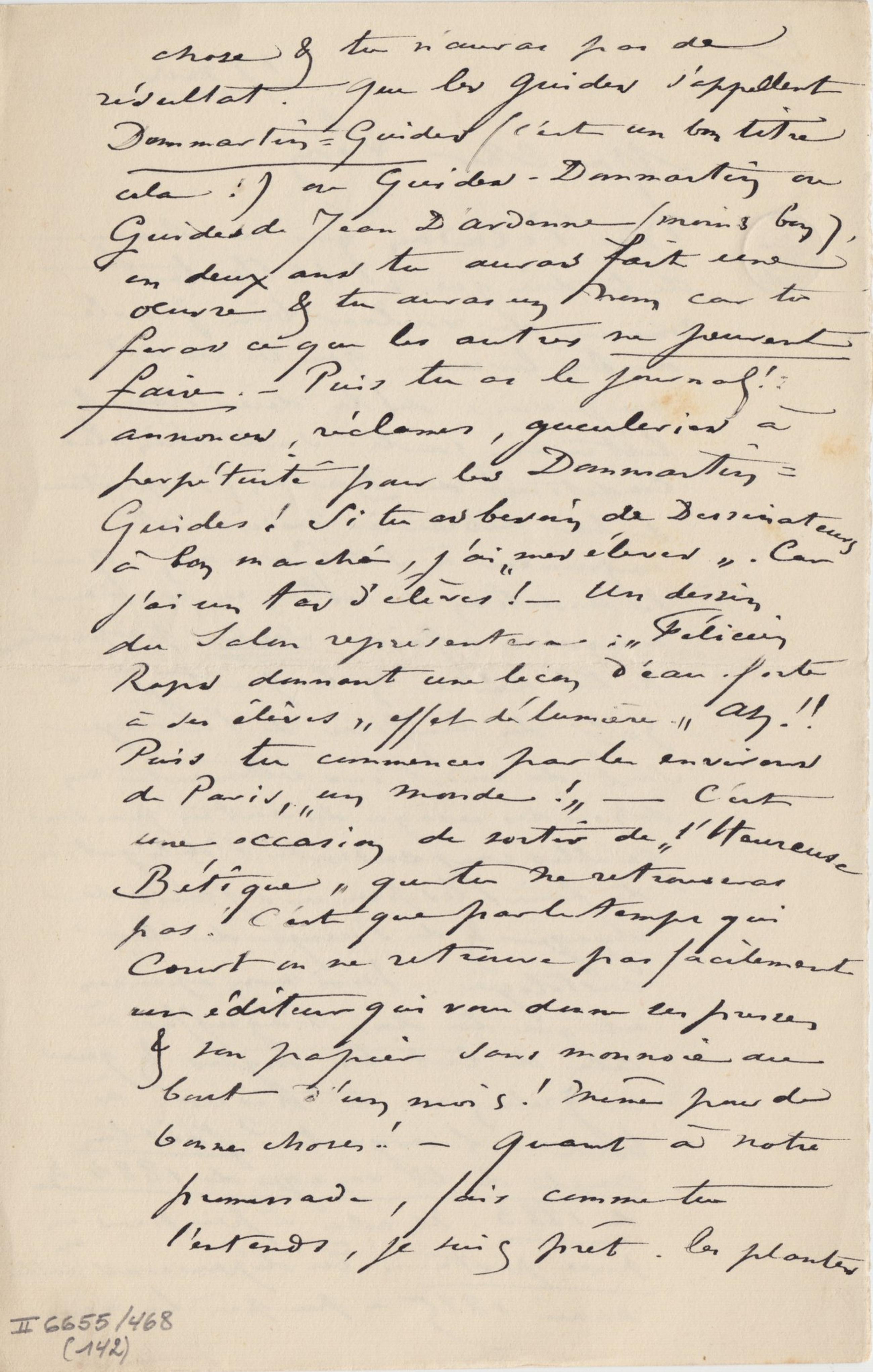 chose & tu n’auras pas de résultat. Que les guides s’appellent Dommartin-Guides (c’est un bon titre cela !) ou Guides-Dommartin ou Guides de Jean D’Ardenne (moins bon), en deux ans tu auras fait une œuvre & tu auras un nom car tu feras ce que les autres ne peuvent faire. – Puis tu as le journal ! : annonces, réclames, gueuleries à perpétuité pour les Dommartin-Guides ! Si tu as besoin de Dessinateurs à bon marché, j’ai « mes élèves ». Car j’ai un tas d’élèves ! – Un dessin du Salon représentera : « Félicien Rops donnant une leçon d’eau-forte à ses élèves » effet de lumière » Ah !! Puis tu commences par les environs de Paris, « un monde ! » – C’est une occasion de sortir de « l’Heureuse Bétîque » que tu ne retrouveras pas. C’est que par le temps qui court on ne retrouve pas facilement un éditeur qui vous donne ses presses & son papier sans monnaie au bout d’un mois ! Même pour de bonnes choses ! – Quant à notre promenade, fais comme tu l’entends, je suis prêt. les plantes