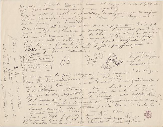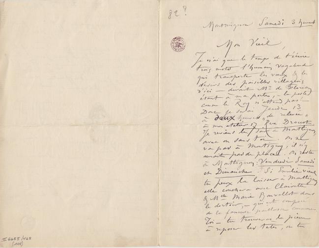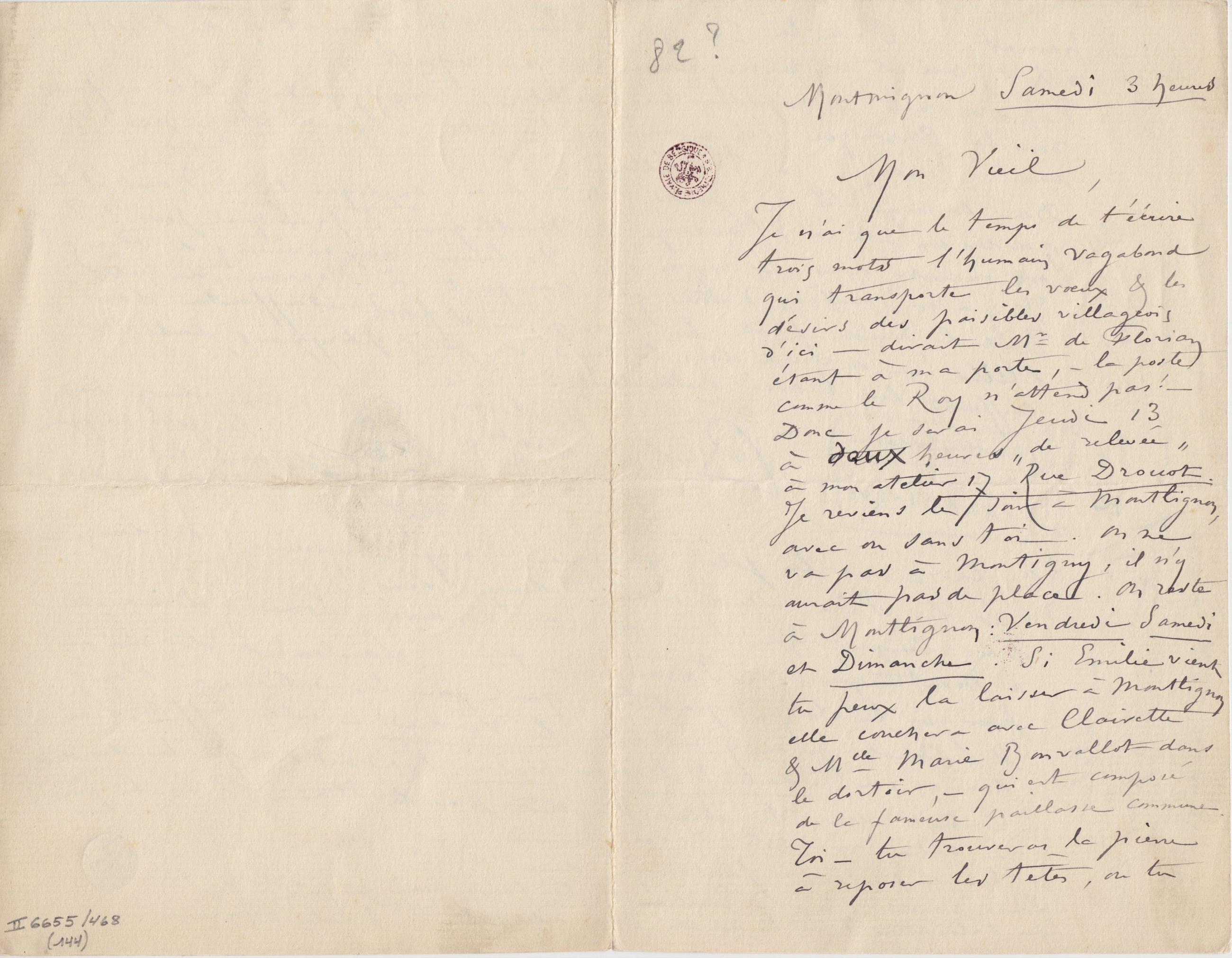 Je n’ai que le temps de t’écrire trois mots l’humain vagabond qui transporte les vœux & les désirs des paisibles villageois d’ici – dirait Mr de Florian étant à ma porte, – la poste comme le Roy n’attend pas ! – Donc je serai Jeudi 13 à deux heures « de relevée » à mon atelier 17 Rue Drouot. Je reviens le soir à Montlignon, avec ou sans toi. On ne va pas à Montigny, il n’y aurait pas de place. On reste à Montlignon : Vendredi Samedi et Dimanche. Si Émilie vient tu peux la laisser à Montlignon elle couchera avec Clairette & Mlle Marie Bonvallot dans le dortoir, – qui est composé de la fameuse paillasse commune. Toi – tu trouveras la pierre à reposer les têtes, où tu