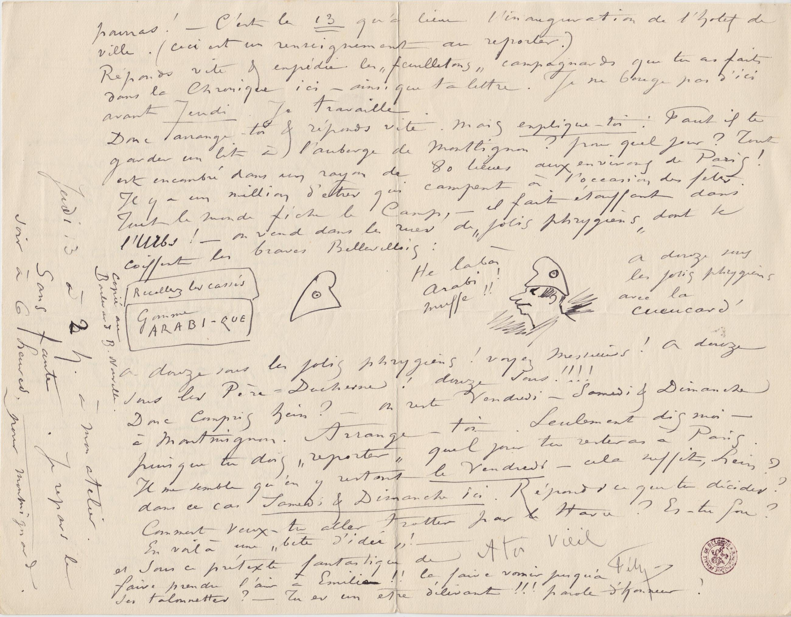Donc Compris hein ? – on reste Vendredi – Samedi & Dimanche à Montmignon. Arrange-toi. Seulement dis moi – puisque tu dois « reporter » quel jour tu resteras à Paris. Il me semble qu’en y restant le Vendredi – cela suffit, hein ? dans ce cas Samedi & Dimanche ici. Réponds ce que tu décides ? Comment veux-tu aller trotter par le Havre ? Es-tu fou ? En voilà une « bête d’idée » !
