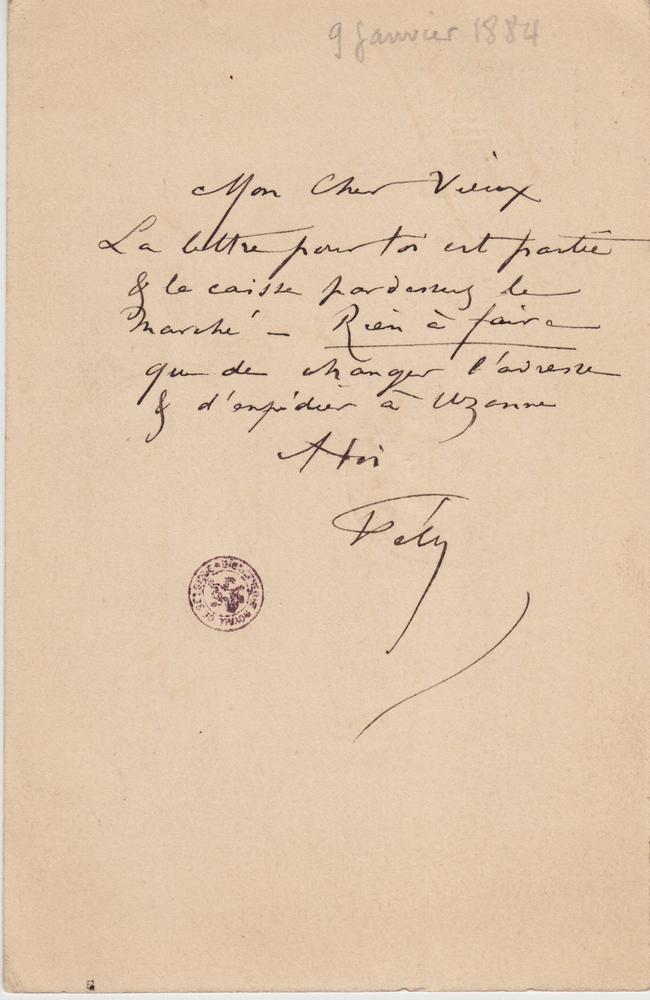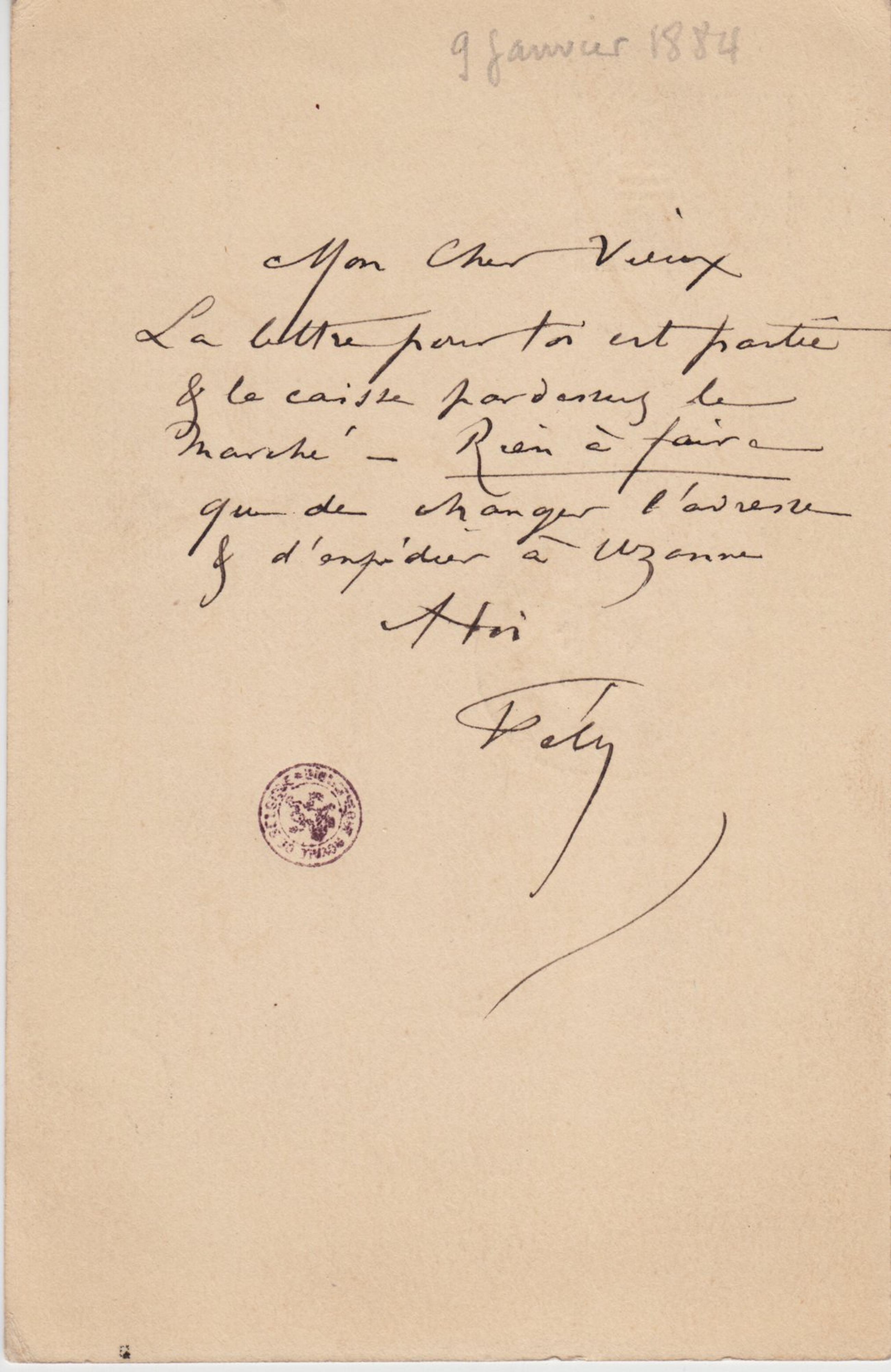 La lettre pour toi est partie & la caisse par dessus le marché – Rien à faire que de changer l’adresse & l’expédier à Uzanne