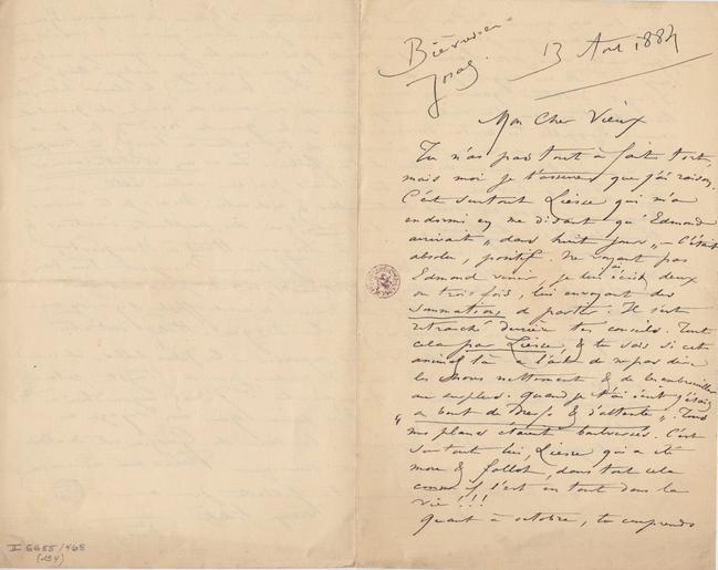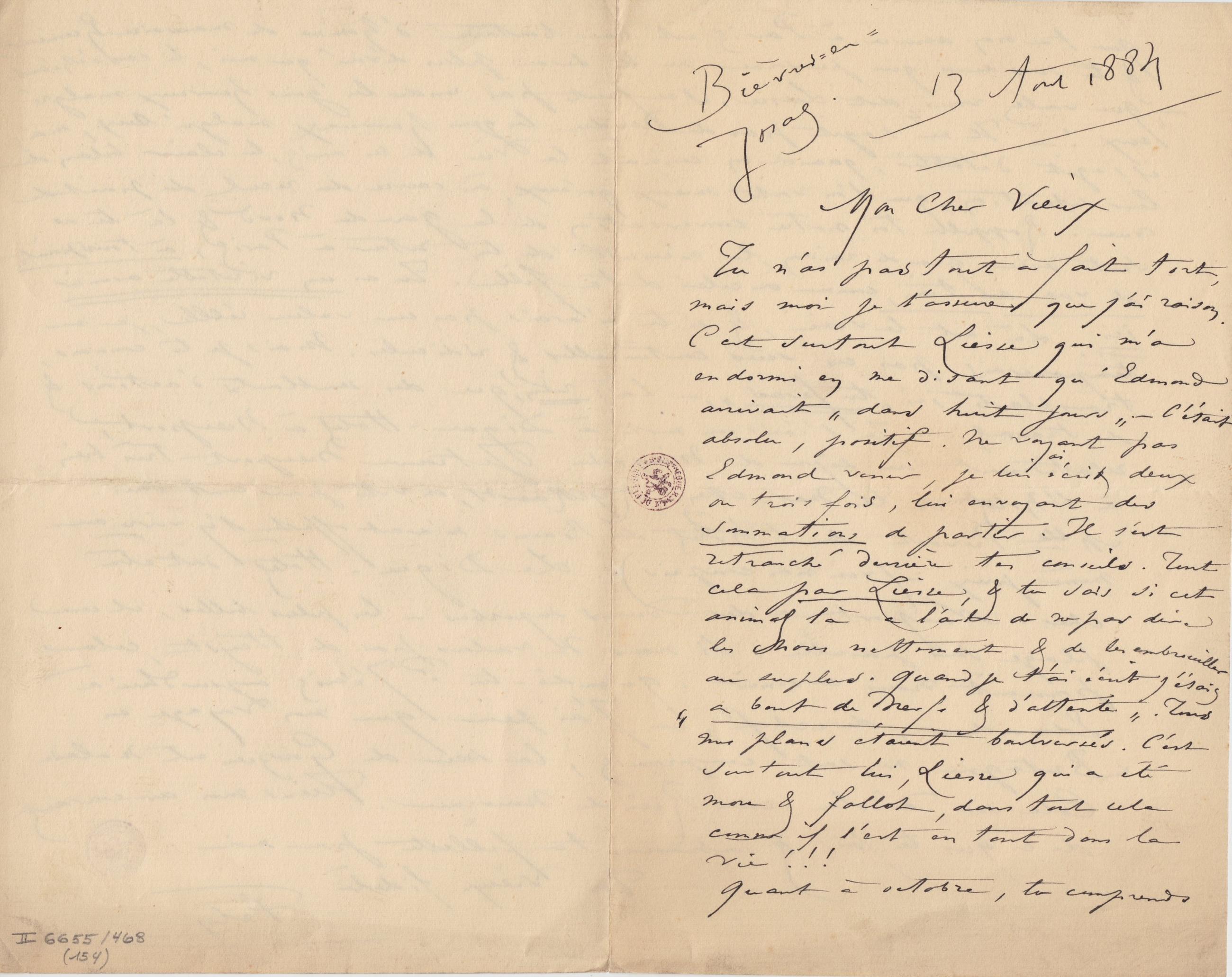 Tu n’as pas tout à fait tort, mais moi je t’assure que j’ai raison. C’est surtout Liesse qui m’a endormi en me disant qu’Edmond arrivait « dans huit jours » – C’était absolu, positif. Ne voyant pas Edmond venir, je lui ai écrit deux ou trois fois, lui envoyant des sommations de partir. Il s’est retranché derrière tes conseils. Tout cela par Liesse, & tu sais si cet animal là a l’art de ne pas dire les choses nettement & de les embrouiller au surplus. Quand je t’ai écrit j’étais « a bout de nerfs & d’attente ». Tous mes plans étaient boulversés. C’est surtout lui, Liesse qui a été mou & fallot, dans tout cela comme il l’est en tout dans la vie !!!