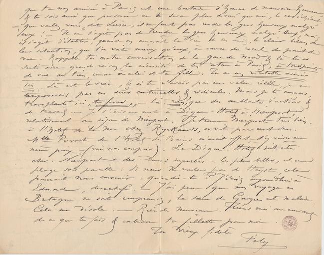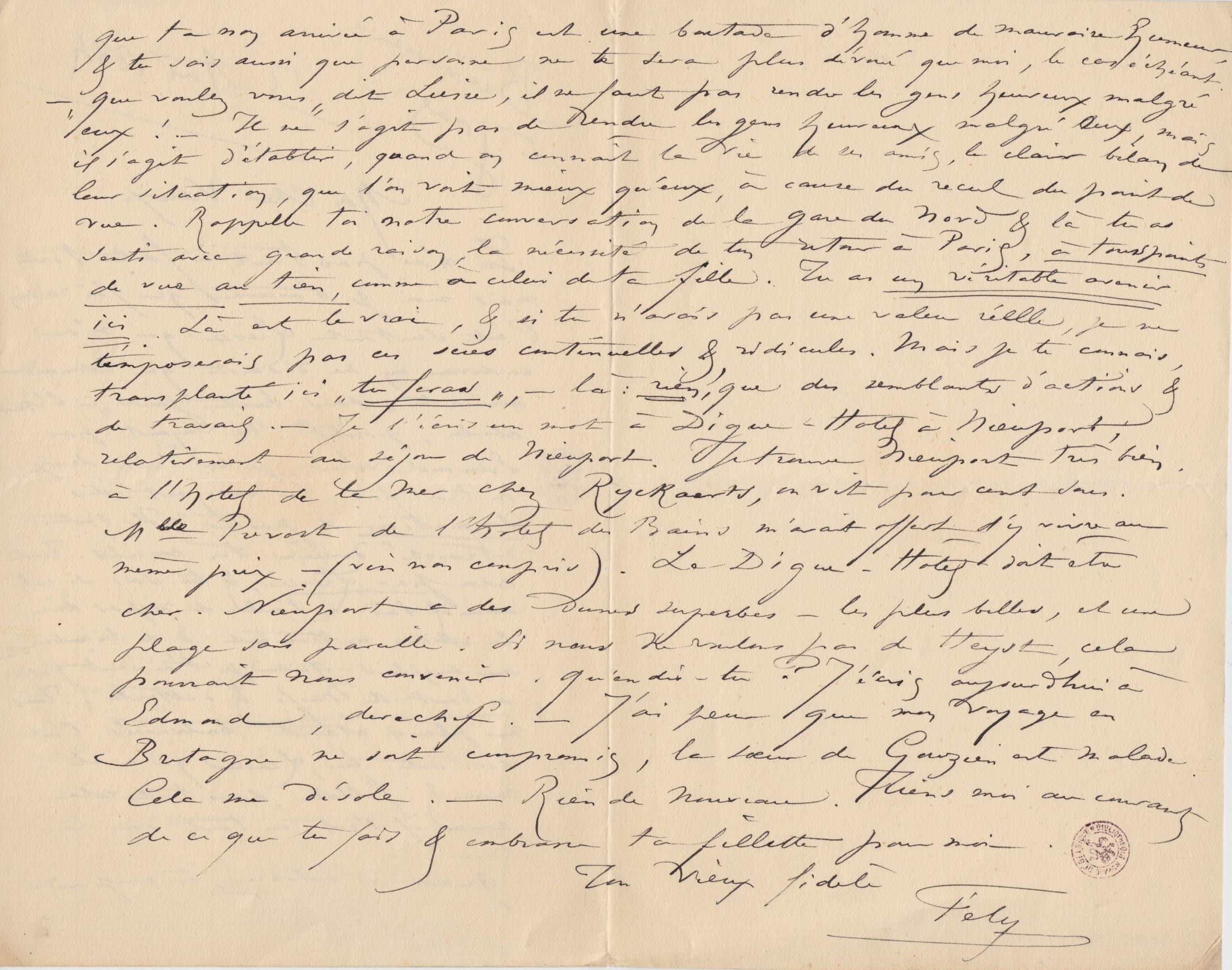 – « que voulez-vous » dit Liesse, il ne faut pas rendre les gens heureux malgré eux ! – Il ne s’agit pas de rendre les gens heureux malgré eux, mais il s’agit d’établir, quand on connaît la vie de ses amis, le clair bilan de leur situation, que l’on voit mieux qu’eux, à cause du recul du point de vue. Rappelle toi notre conversation de la gare du Nord & là tu as senti avec grande raison, la nécessité de ton retour à Paris, à tous points de vue au tien, comme à celui de ta fille. Tu as un véritable avenir ici. Là est le vrai, & si tu n’avais pas une valeur réelle, je ne t’imposerais pas ces scies continuelles & ridicules. Mais je te connais, transplanté ici « tu feras », – là : rien, que des semblants d’actions & de travail. – Je t’écris un mot à Digue-Hotel à Nieuport ; relativement au séjour de Nieuport. Je trouve Nieuport très bien, à l’hôtel de la mer chez Ryckaerts, on vit pour cent sous. Mlle Prevost de l’hôtel des Bains m’avait offert d’y vivre au même prix – (vin non compris). Le Digue-Hôtel doit être cher. Nieuport a des dunes superbes – les plus belles, et une plage sans pareille. Si nous ne voulons pas de Heyst, cela pourrait nous convenir. Qu’en dis-tu ? J’écris aujourdhui à Edmond, derechef. – J’ai peur que mon voyage en Bretagne ne soit compromis, la sœur de Gouzien est malade. Cela me désole. – Rien de nouveau.