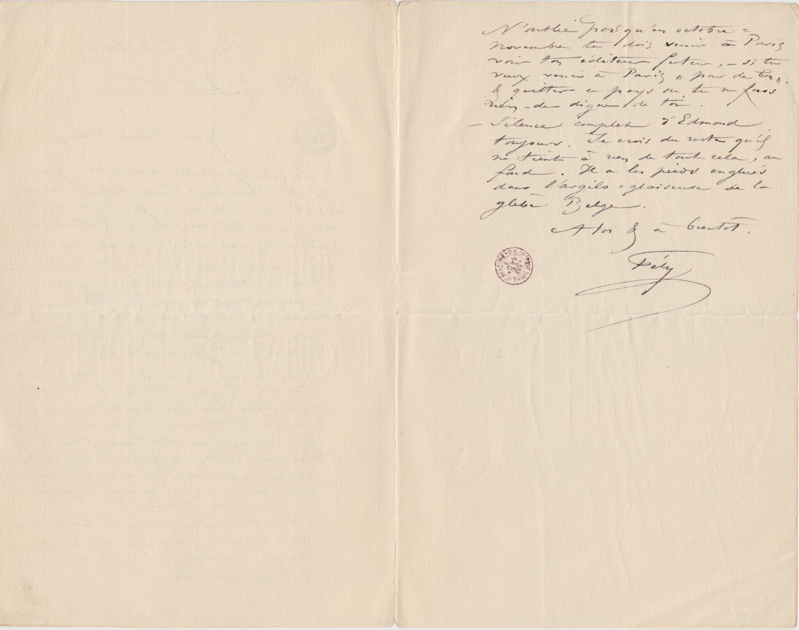 N’oublie pas qu’en octobre-novembre tu dois venir à Paris voir ton éditeur futur, – si tu veux venir à Paris « pour de bon » & quitter ce pays où tu ne feras rien – de digne de toi.