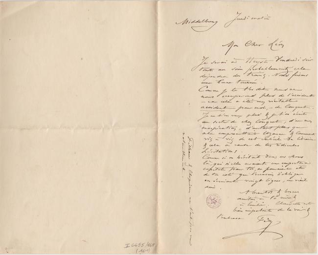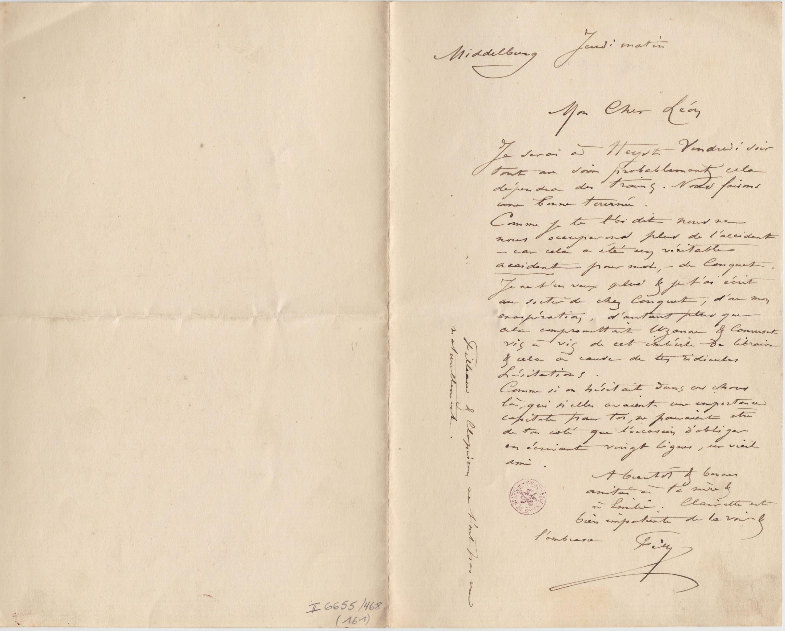 Comme je te l’ai dit nous ne nous occuperons plus de l’accident – car cela a été un véritable accident pour moi, – de Conquet. Je ne t’en veux plus & je t’ai écrit au sortir de chez Conquet, d’où mon exaspération, d’autant plus que cela compromettrait Uzanne & Camuset vis à vis de cet imbécile de libraire & cela à cause de tes ridicules hésitations.