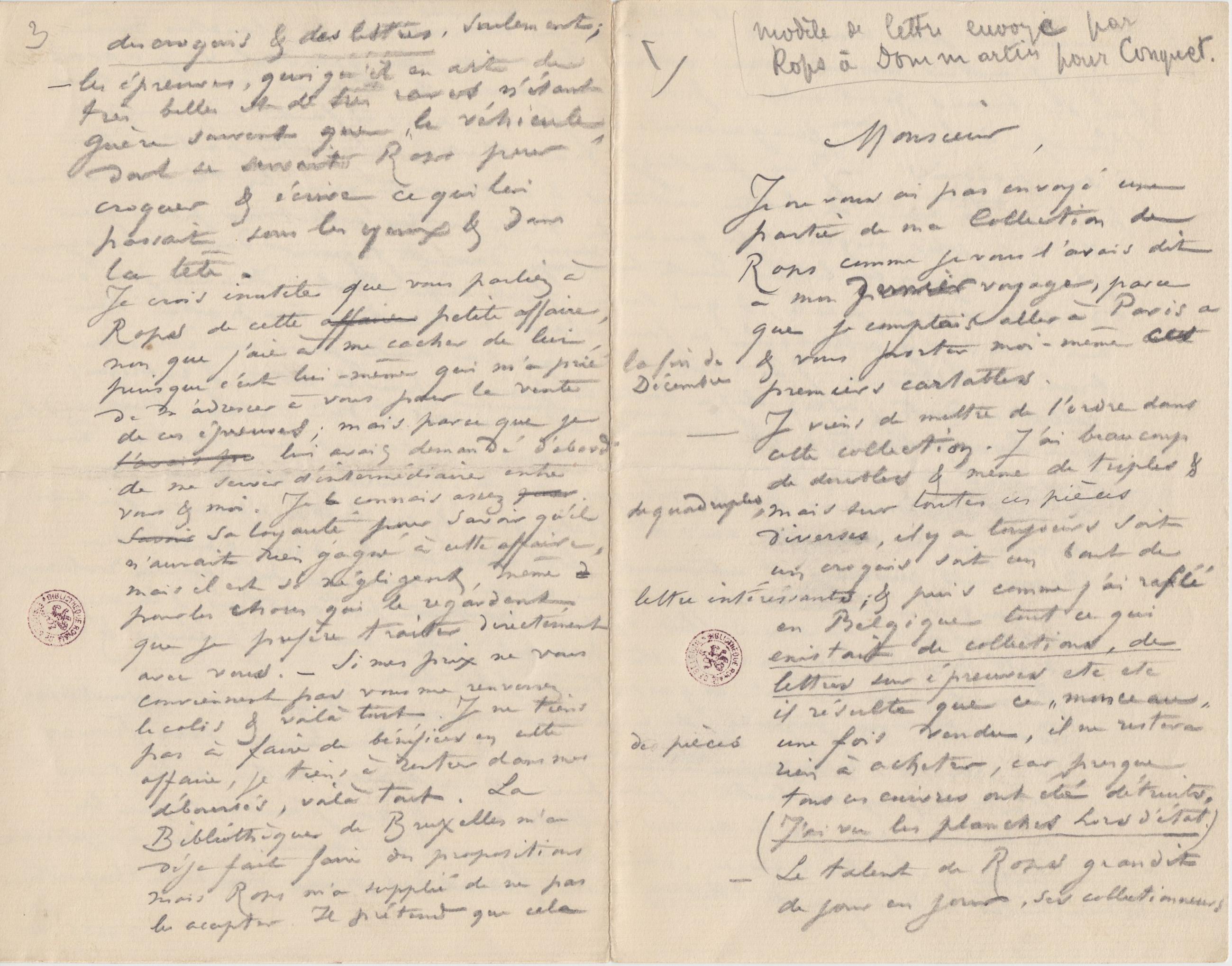 Je crois inutile que vous parliez à Rops de cette affaire petite affaire, non que j’aie à me cacher de lui, puisque c’est lui-même qui m’a prié de m’adresser à vous pour la vente de ces épreuves ; mais parce que je l’avais pr lui avais demandé d’abord de me servir d’intermédiaire entre vous & moi. Je le connais assez pour savoir sa loyauté pour savoir qu’il n’aurait rien gagné à cette affaire, mais il est si négligent, même d pour les choses qui le regardent, que je prefère traiter directement avec vous. – Si mes prix ne vous conviennent pas vous me renverrez le colis & voilà tout. Je ne tiens pas à faire de bénéfices en cette affaire, je tiens à rentrer dans mes déboursés, voilà tout. La Bibliothèque de Bruxelles m’en a déja fait faire des propositions mais Rops m’a supplié de ne pas les accepter. Il prétend que cela