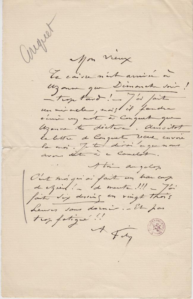 Ta caisse n’est arrivée à Uzanne que Dimanche soir ! – trop tard ! – J’ai fait un miracle, mais il faudra écrire un mot à Conquet que Uzanne te dictera. Aussitot la lettre de Conquet reçue envoie la moi. Je te dirai ce que nous avons dit à ce Camelot.