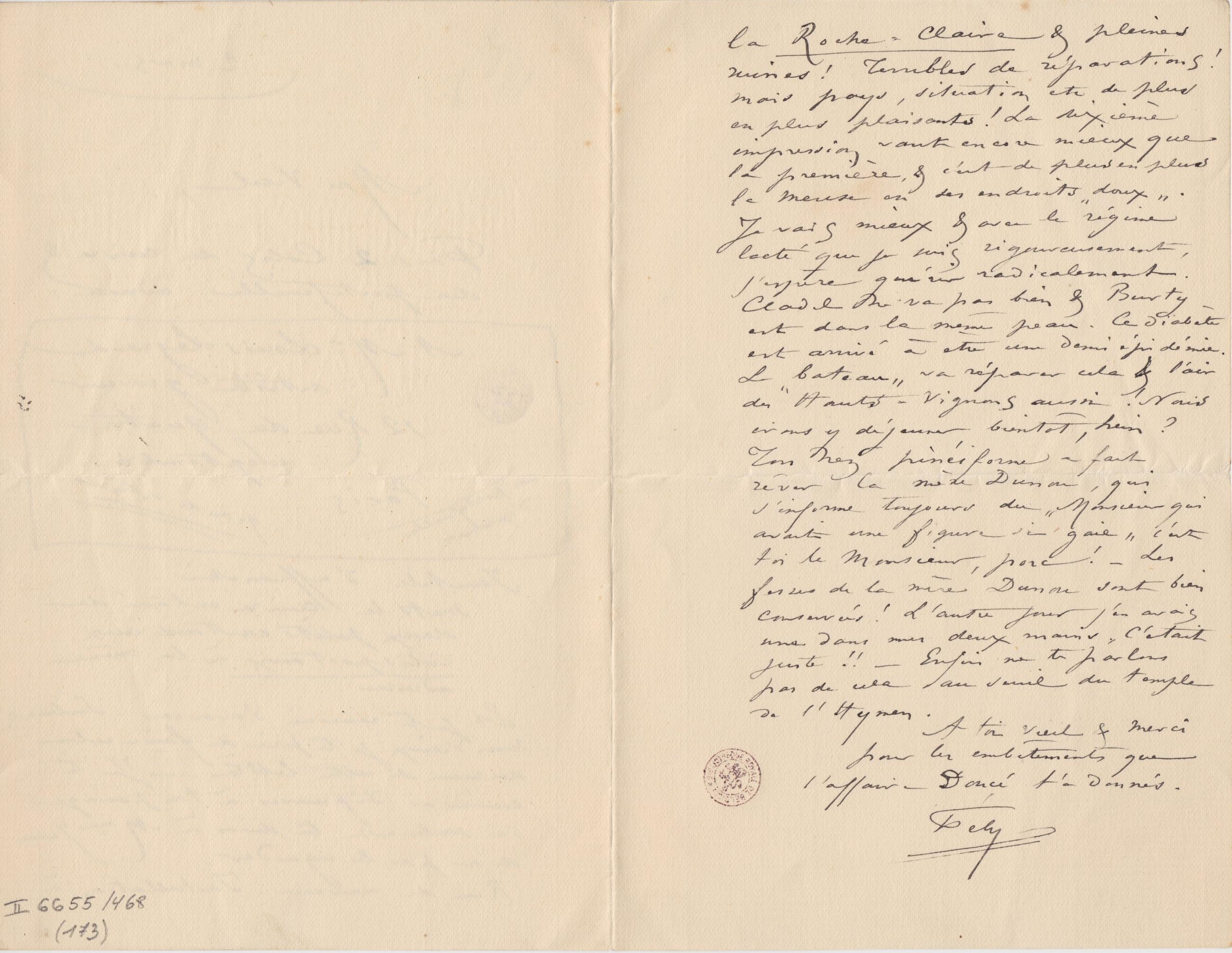la Roche-Claire & pleines ruines ! Terribles de réparations ! mais pays, situation etc de plus en plus plaisants ! La dixième impression vaut encore mieux que la première, & c’est de plus en plus la Meuse en ses endroits « doux ». Je vais mieux & avec le régime lacté que je suis rigoureusement, j’espère guérir radicalement. Cladel ne va pas bien & Burty est dans la même peau. Ce diabète est arrivé à être une demi épidémie. Le « bateau » va réparer cela & l’air des Hauts-Vignons aussi ! Nous irons y déjeuner bientôt, hein ? Ton nez pinéiforme a fait rêver la mère Dunou, qui s’informe toujours du « Monsieur qui avait une figure si gaie » c’est toi le Monsieur, porc ! – Les fesses de la mère Dunou sont bien conservées ! L’autre jour j’en avais une dans mes deux mains. C’était juste !! – Enfin ne te parlons pas de cela au seuil du temple de l’Hymen.