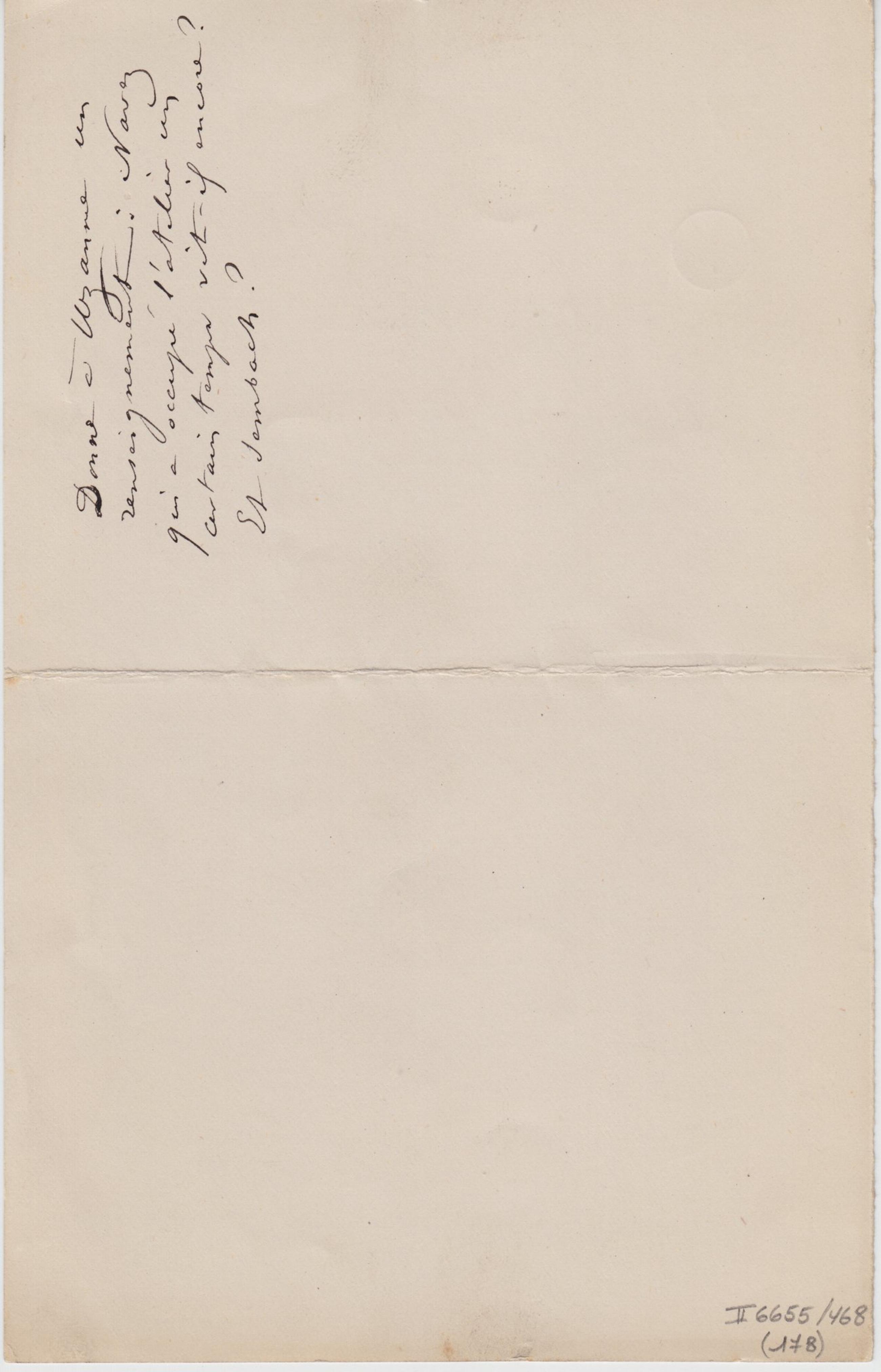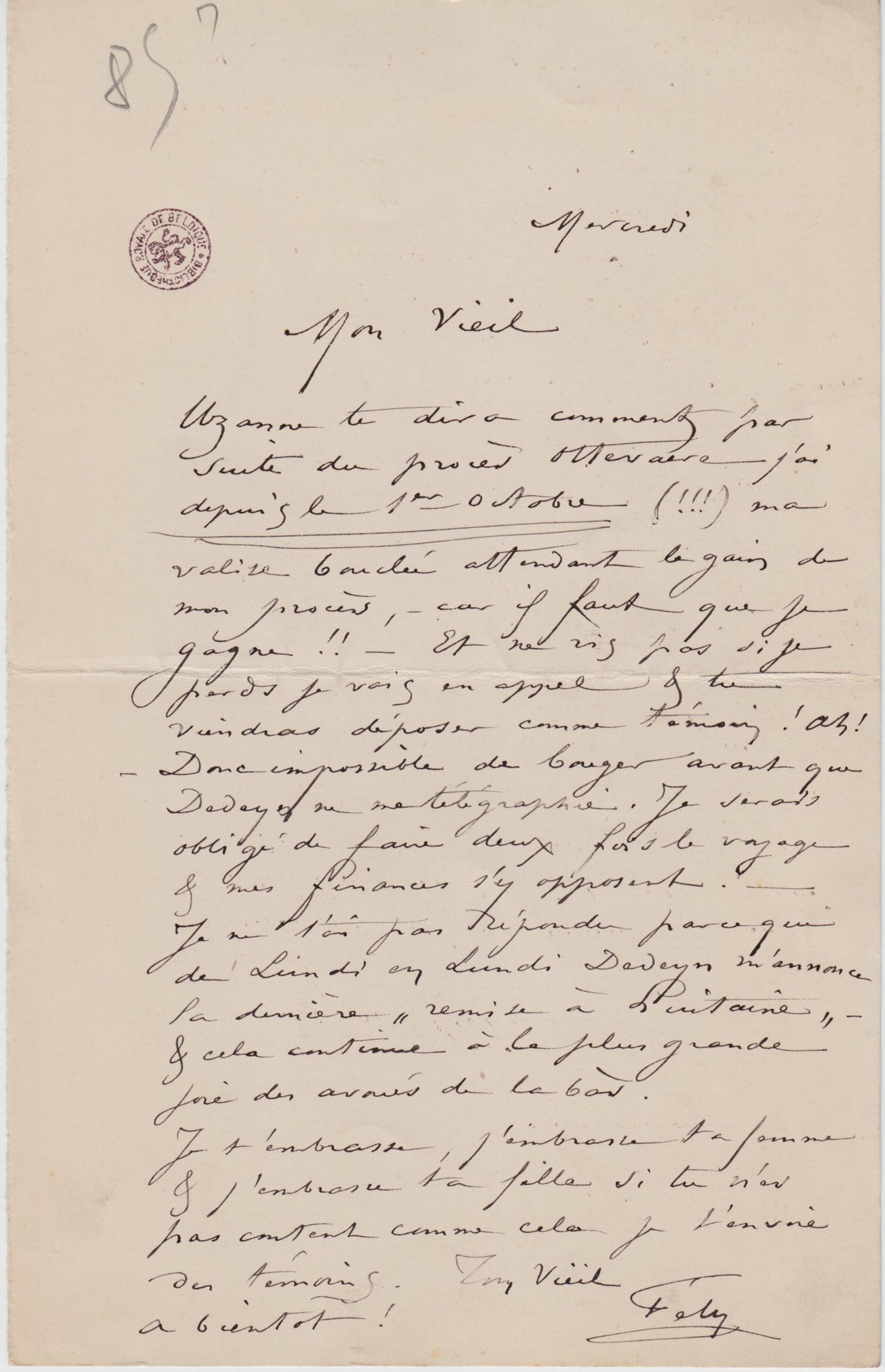 – Donc impossible de bouger avant que Dedeyn ne me télégraphie. Je serais obligé de faire deux fois le voyage & mes finances s’y opposent. – Je ne t’ai pas répondu parce que de Lundi en Lundi Dedeyn m’annonce la dernière « remise à huitaine » – & cela continue à la plus grande joie des avoués de la bàs.