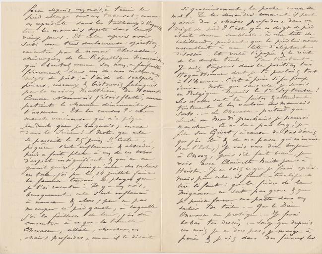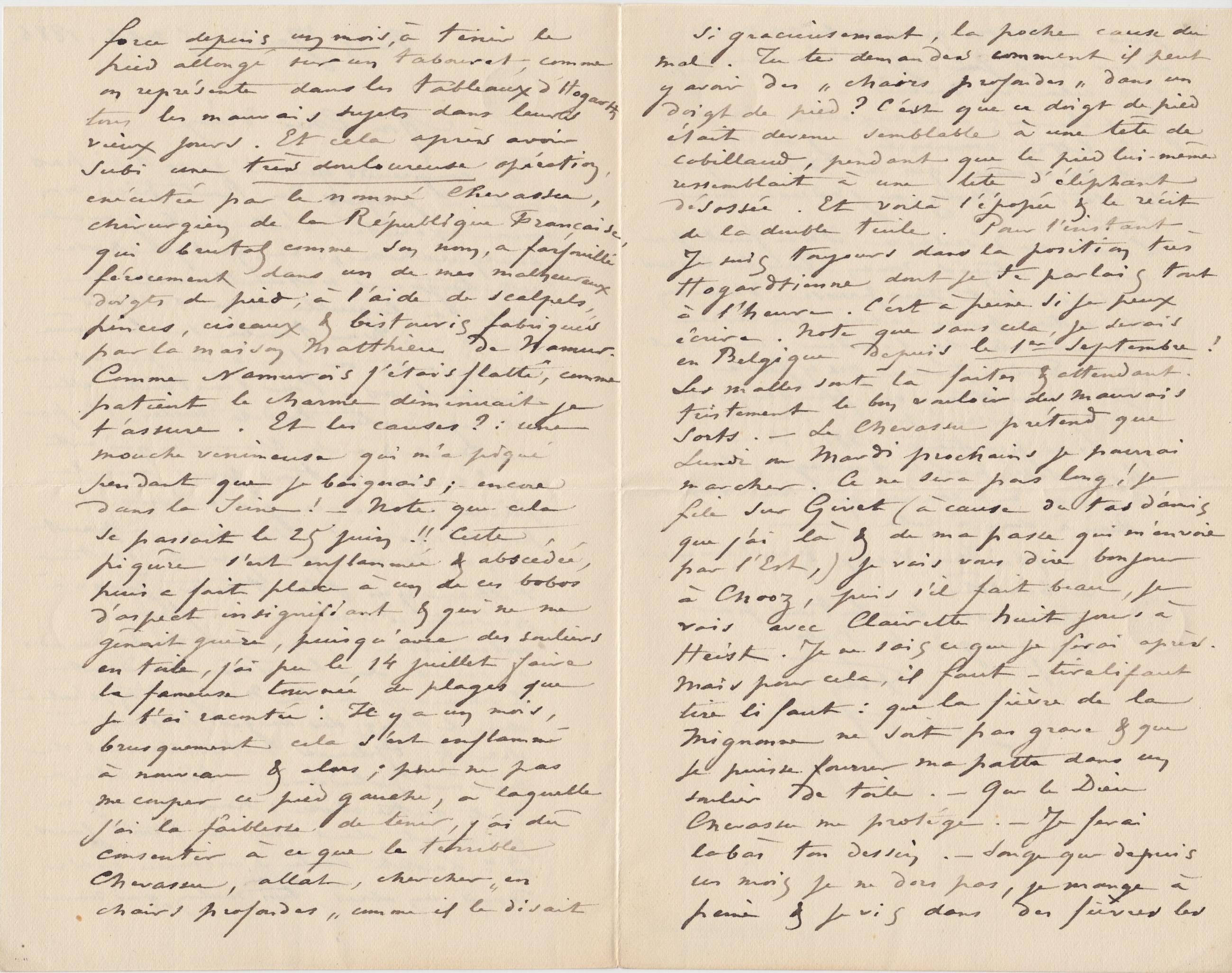 si gracieusement, la poche cause du mal. Tu te demandes comment il peut y avoir des « chairs profondes » dans un doigt de pied ? C’est que ce doigt de pied était devenu semblable à une tête de cabillaud, pendant que le pied lui-même ressemblait à une tête d’éléphant désossée. Et voilà l’épopée & le récit de la double tuile. Pour l’instant Je suis toujours dans la position très Hogardtienne dont je te parlais tout à l’heure. C’est à peine si je peux écrire. Note que sans cela, je serais en Belgique depuis le 1er septembre ! Les malles sont là faites & attendant tristement le bon vouloir des mauvais sorts. – Le Chevassu prétend que Lundi ou Mardi prochains je pourrai marcher. Ce ne sera pas long ! je file sur Givet (à cause du tas d’amis que j’ai là & de ma passe qui m’envoie par l’Est,) je vais vous dire bonjour à Chooz, puis s’il fait beau, je vais avec Clairette huit jours à Heist. Je ne sais ce que je ferai après. Mais pour cela, il faut – tirelifaut tire li faut : que la fièvre de la Mignonne ne soit pas grave & que je puisse fourrer ma patte dans un soulier de toile. – Que le Dieu Chevassu me protége. – Je ferai la bàs ton dessin. – Songe que depuis un mois je ne dors pas, je mange à peine & je vis dans des fièvres les