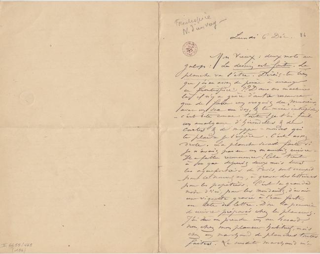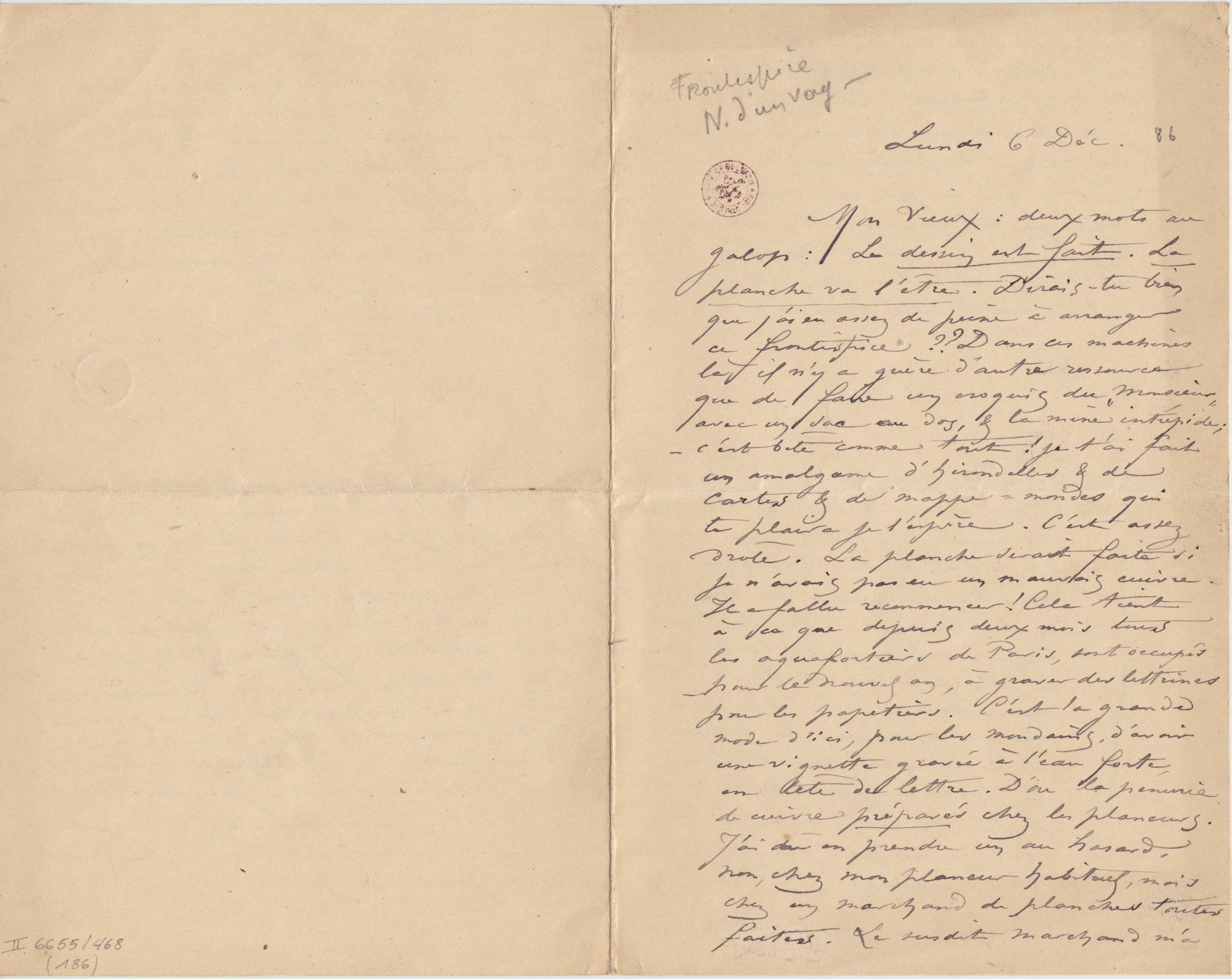 deux mots au galop : Le dessin est fait. La planche va l’être. Dirais-tu bien que j’ai eu assez de peine à arranger ce frontispice ?? Dans ces machines là il n’y a guère d’autre ressource que de faire un croquis du « Monsieur » avec un sac au dos, & la mine intrépide ; – c’est bête comme tout ! je t’ai fait un amalgame d’hirondelles & de cartes & de mappe-mondes qui te plaira je l’espère. C’est assez drôle. La planche serait faite si je n’avais pas eu un mauvais cuivre. Il a fallu recommencer ! Cela tient à ce que depuis deux mois tous les aquafortiers de Paris, sont occupés pour le nouvel an, à graver des lettrines pour les papetiers. C’est la grande mode d’ici, pour les mondains, d’avoir une vignette gravée à l’eau forte, en tête de lettre. D’où la pénurie de cuivre préparés chez les planeurs. J’ai dû en prendre un au hasard, non, chez mon planeur habituel, mais chez un marchand de planches toutes faites. Le susdit marchand m’a